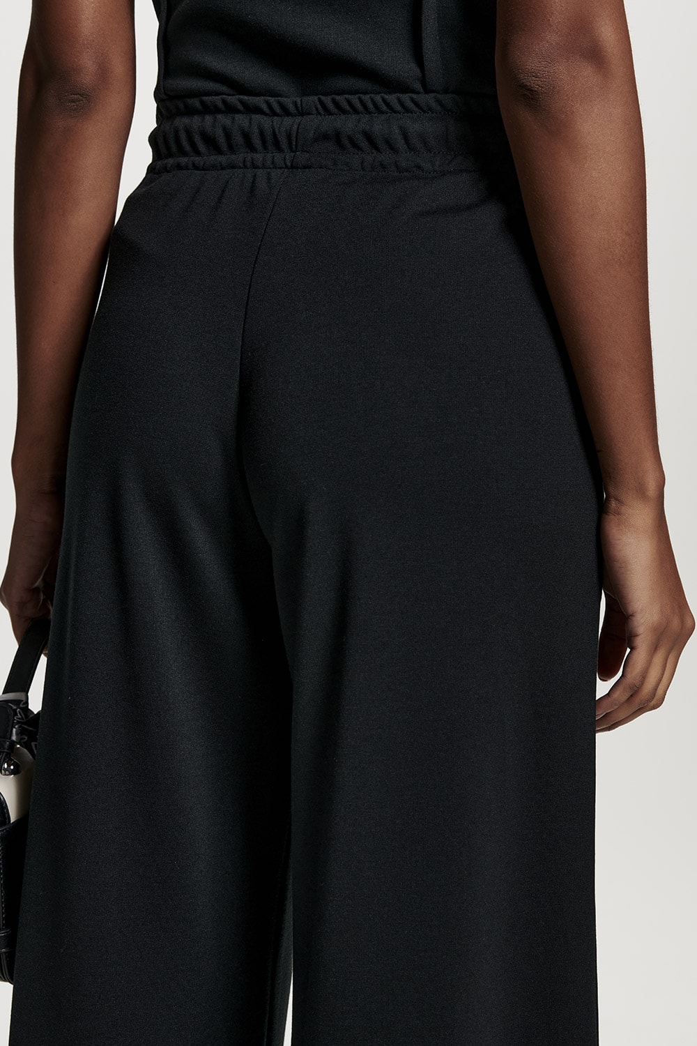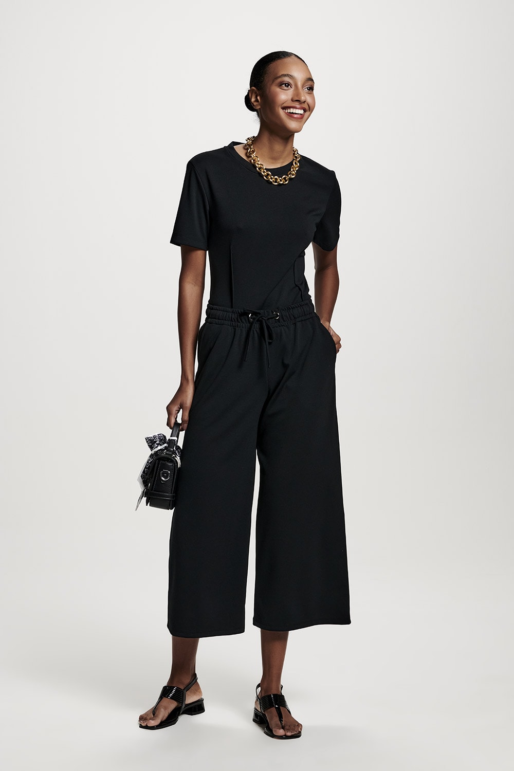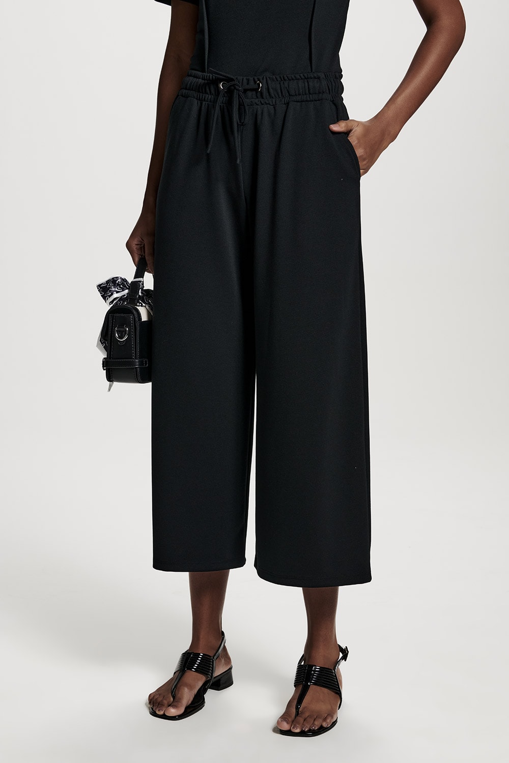 A calça de moletom em comprimento cropped é uma peça de roupa casual e confortável, sendo uma ótima opção para ocasiões descontraídas. A calça possui elástico no cós e cordão na cintura.