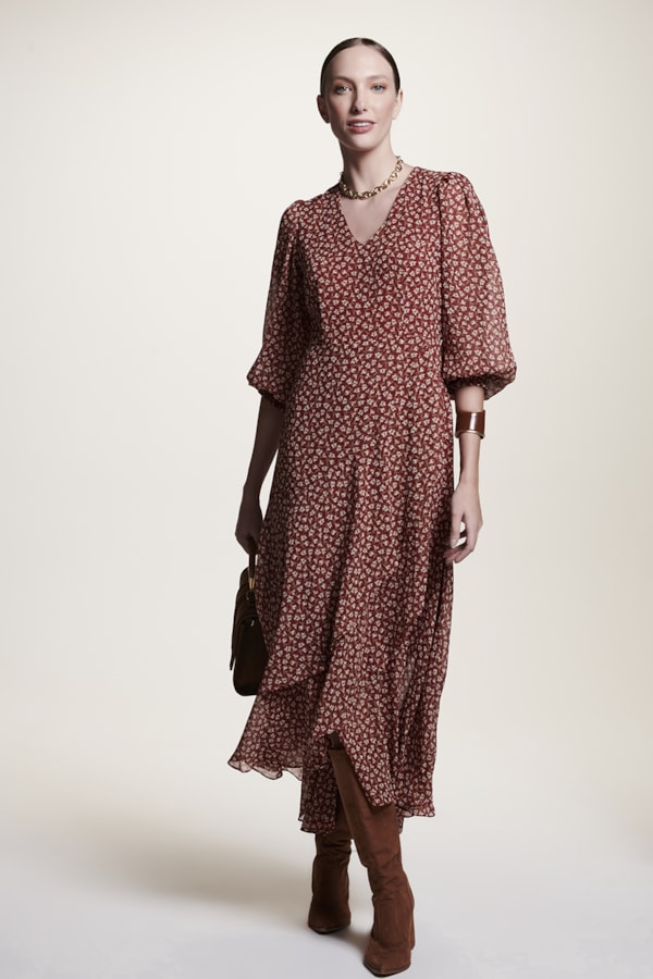 Bata estampa liberty, tem detalhe em babado na manga, decote v e toque macio.