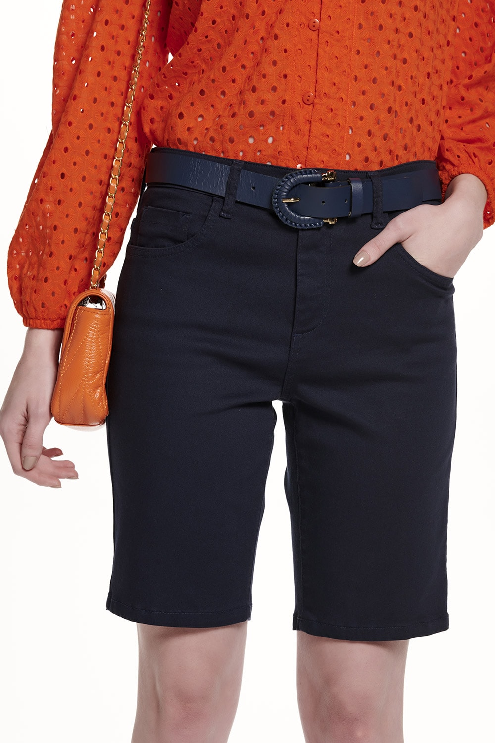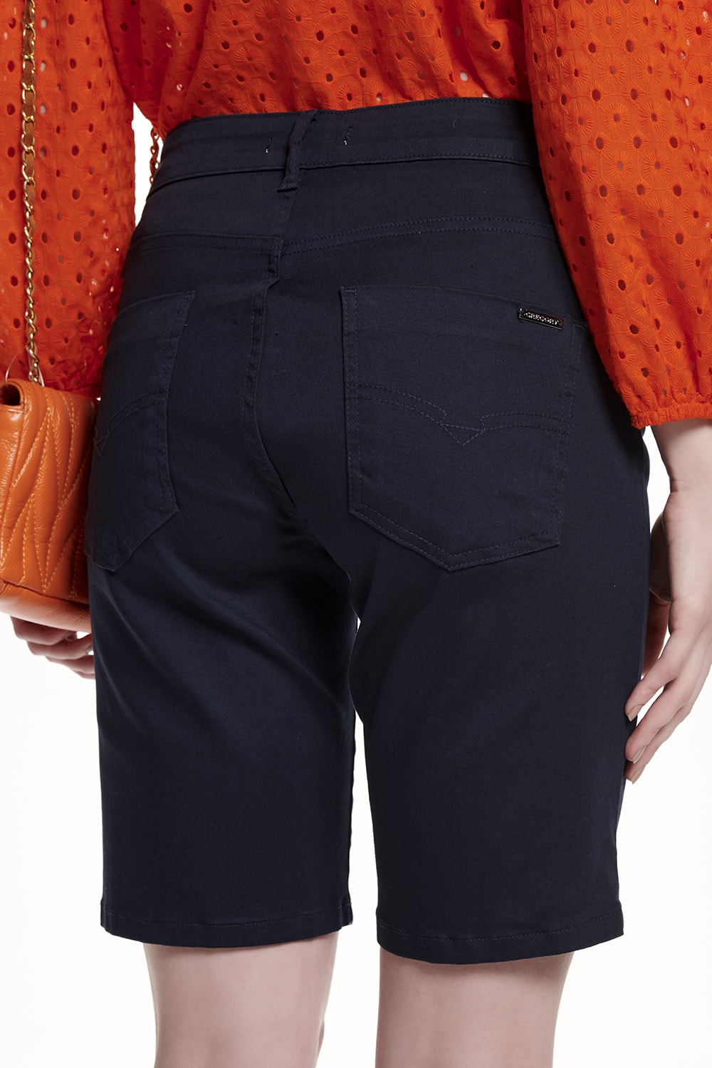 Bermuda em sarja, cós médio com passantes e modelo 5 pockets. Casual e confortável para os dias mais quentes.