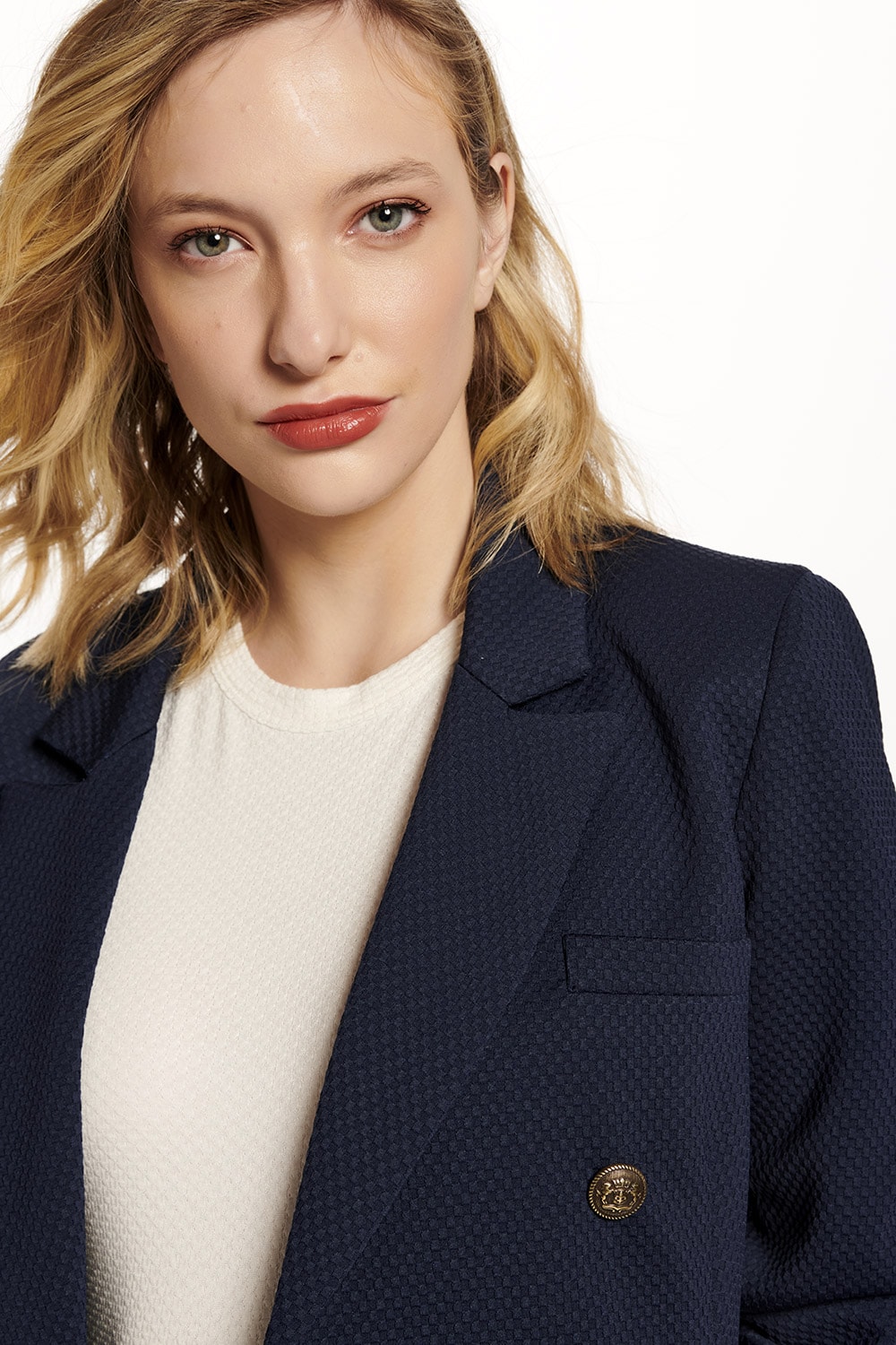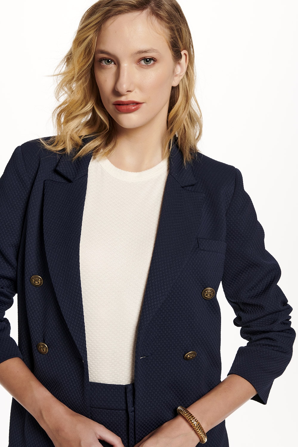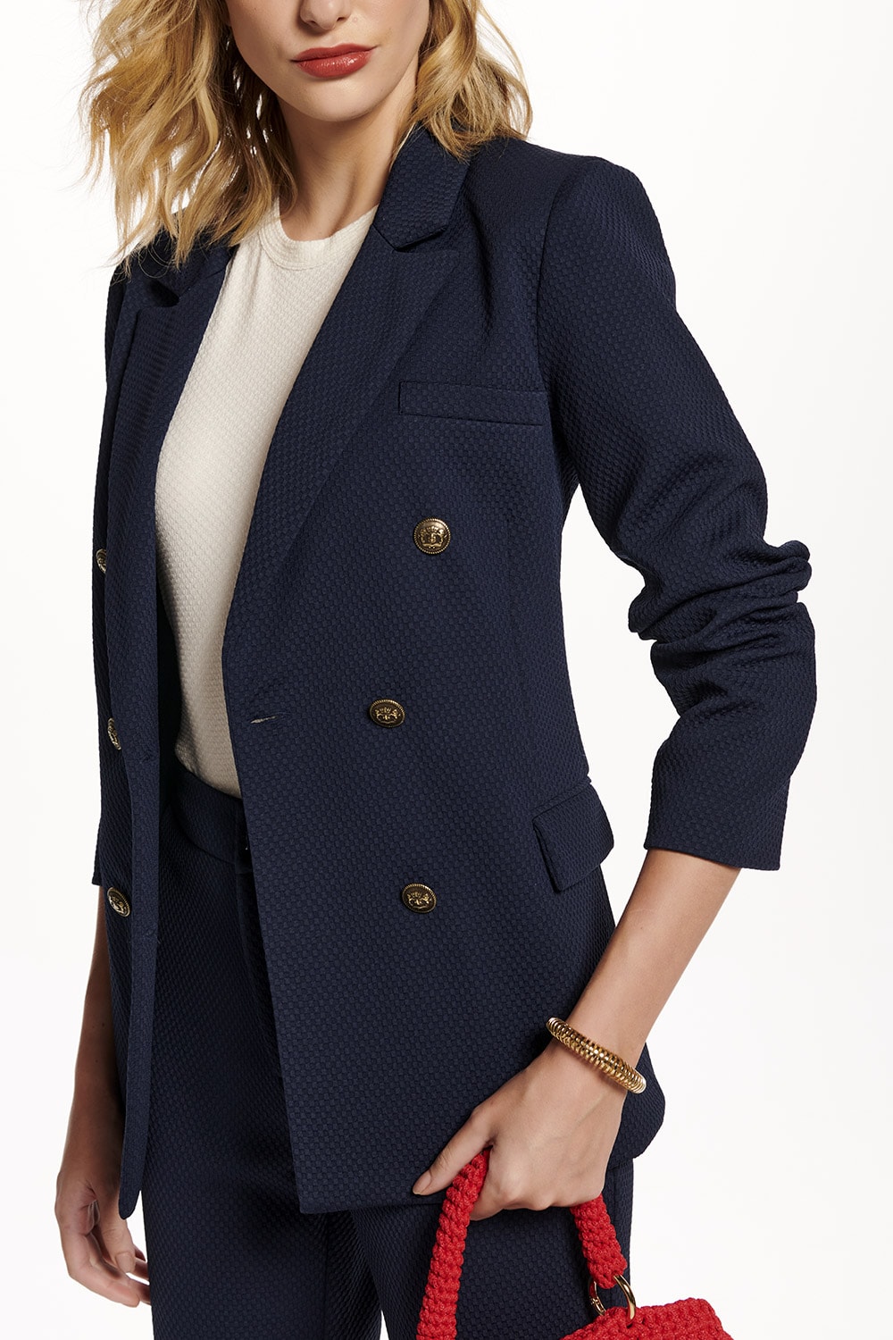 Blazer alfaiataria em malha textura, abotoamento duplo e lapela de bolso. Ideal combinação com a referência 52.01.00040