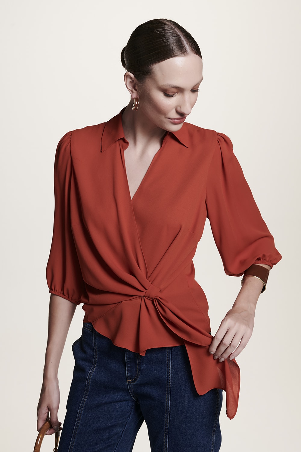 Blusa cachecouer com lindo detalhe de transpasse, tem golinha e lindas cores.