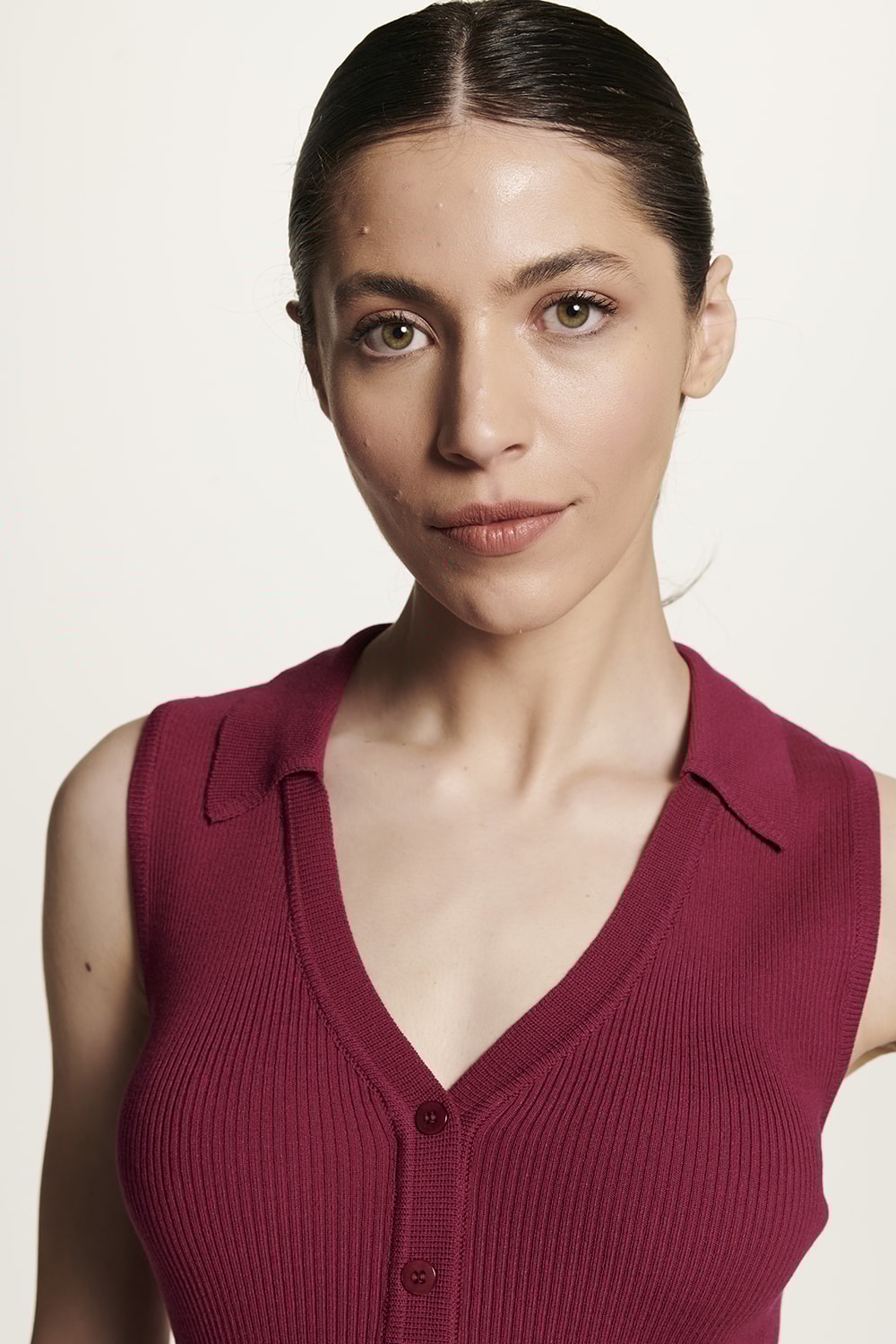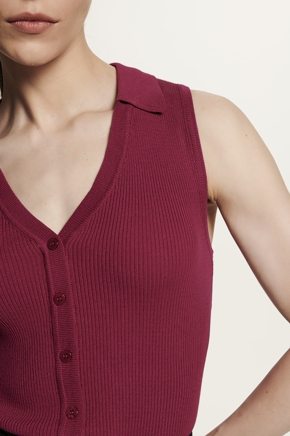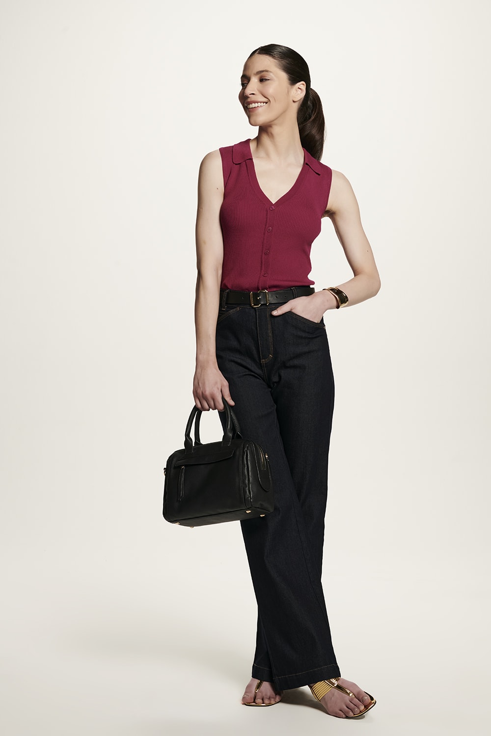 Blusa em tricot canelado decote V com gola esporte e tem botões que fazem o detalhe frontal.