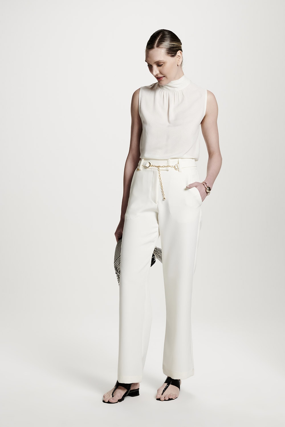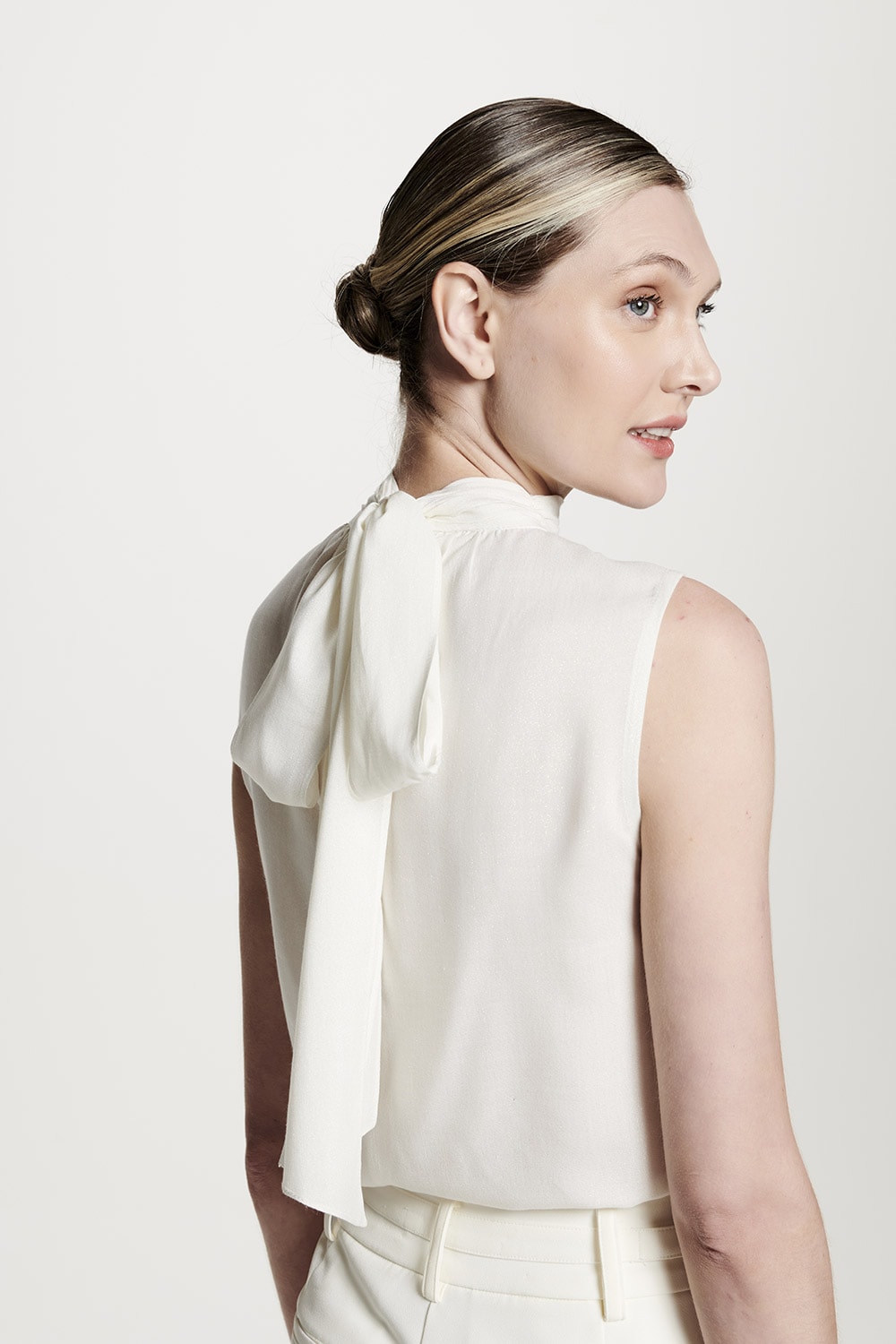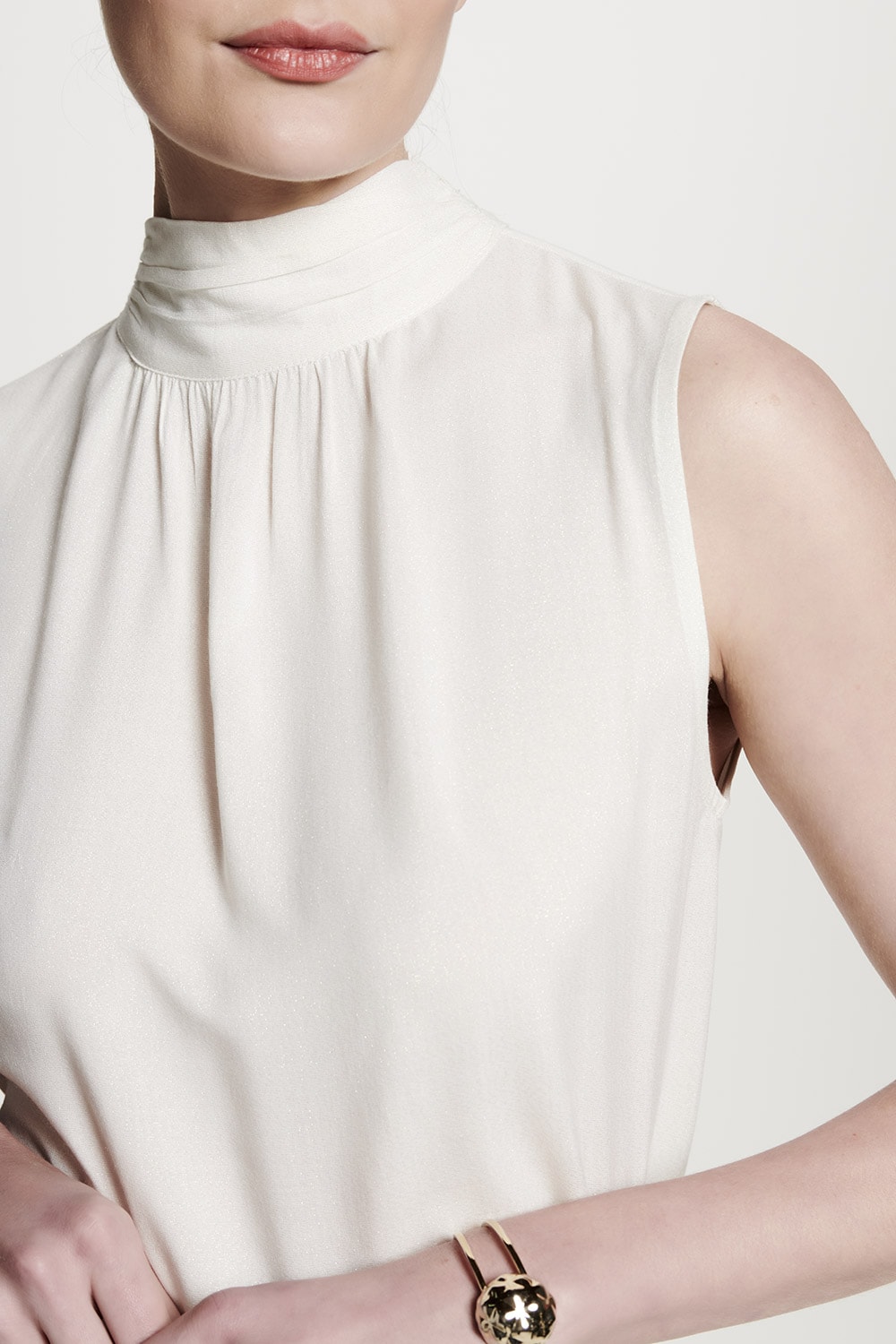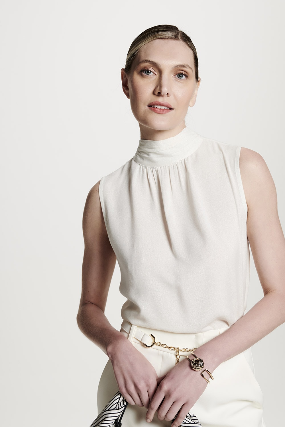 Blusa gola alta franzida tem shape soltinho e amarração atrás.