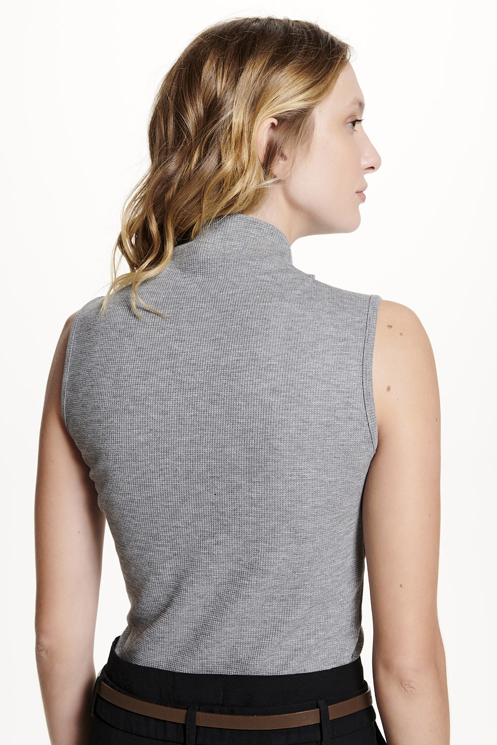 Blusa em malha canelada, modelo sem mangas e gola alta. Moderna e confortável para o dia á dia.