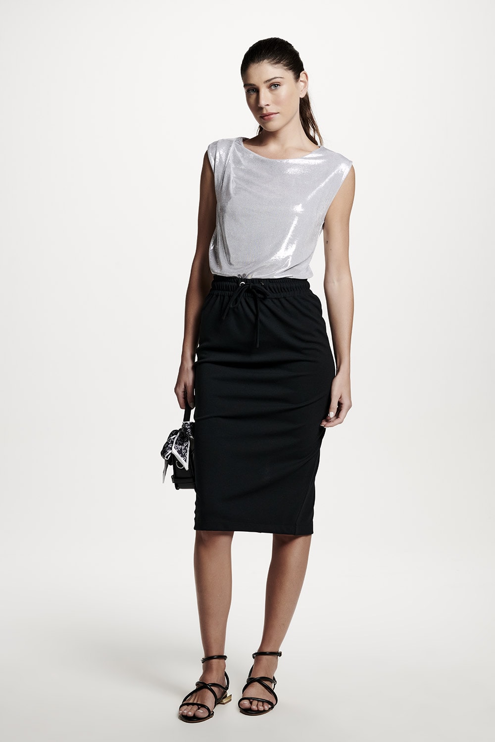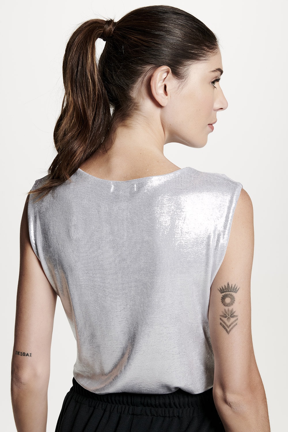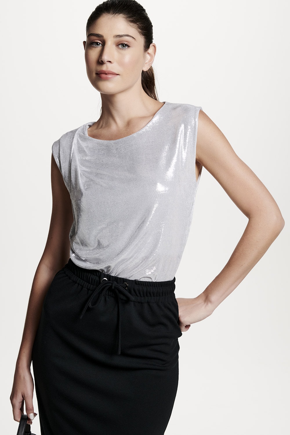Blusa em malha metalizada com pregas no ombro, perfeita para uma ocasião mais especial.