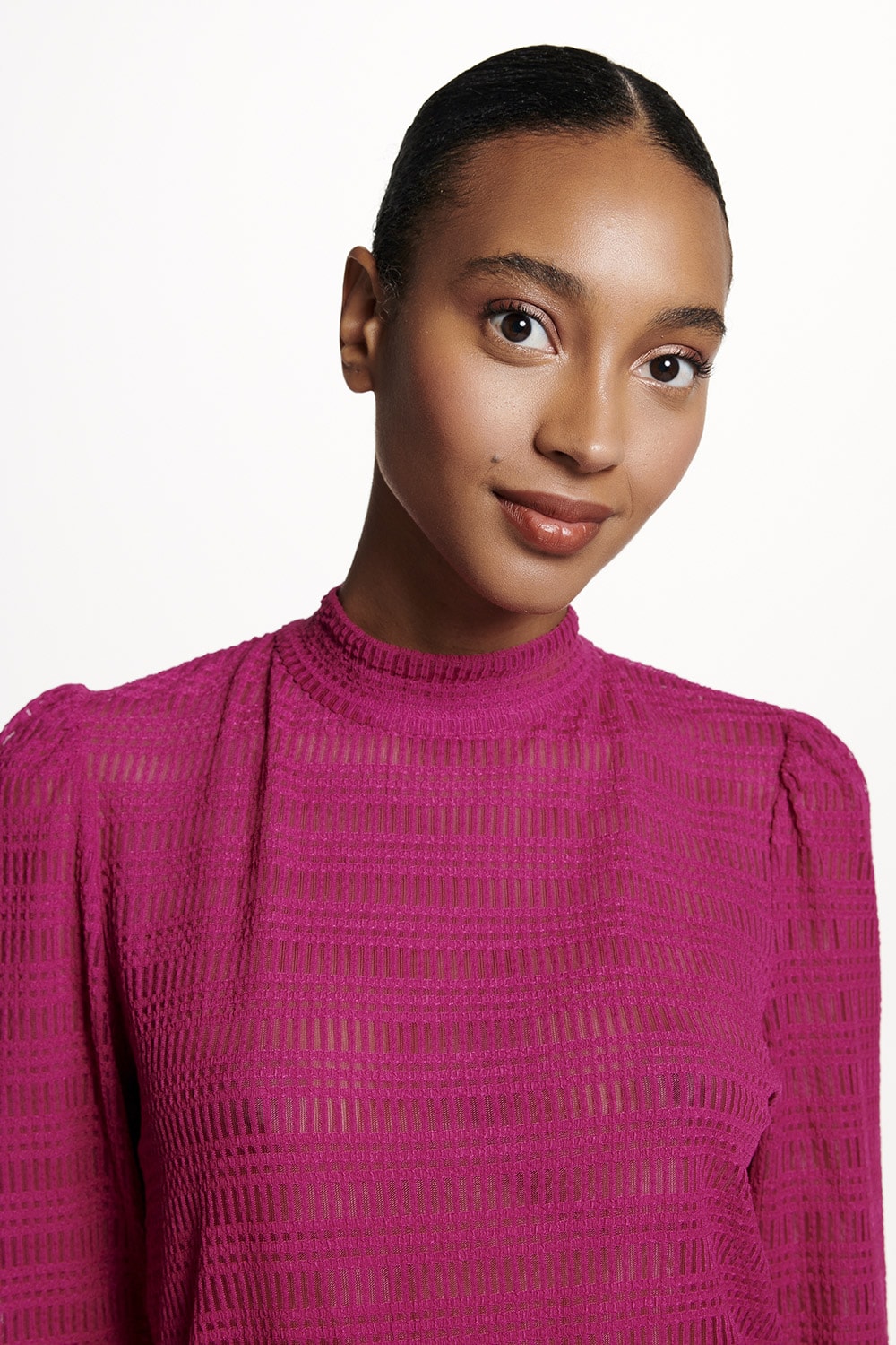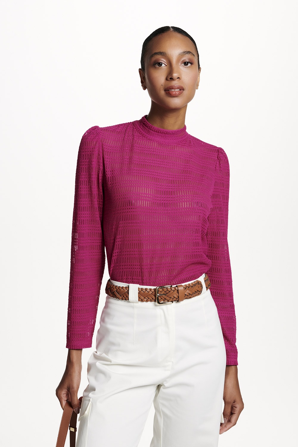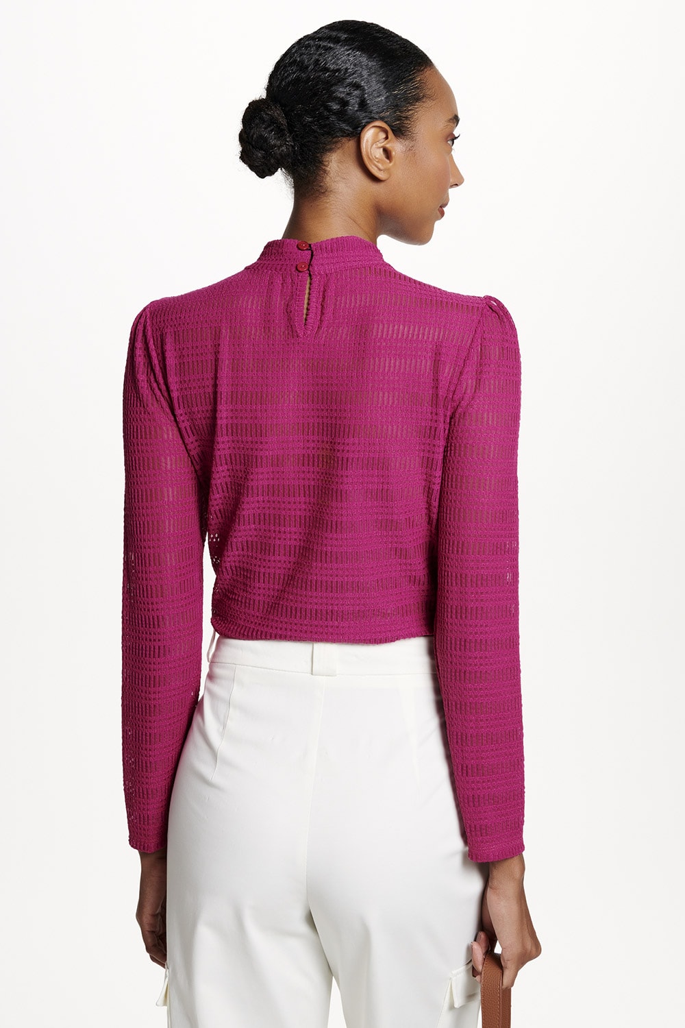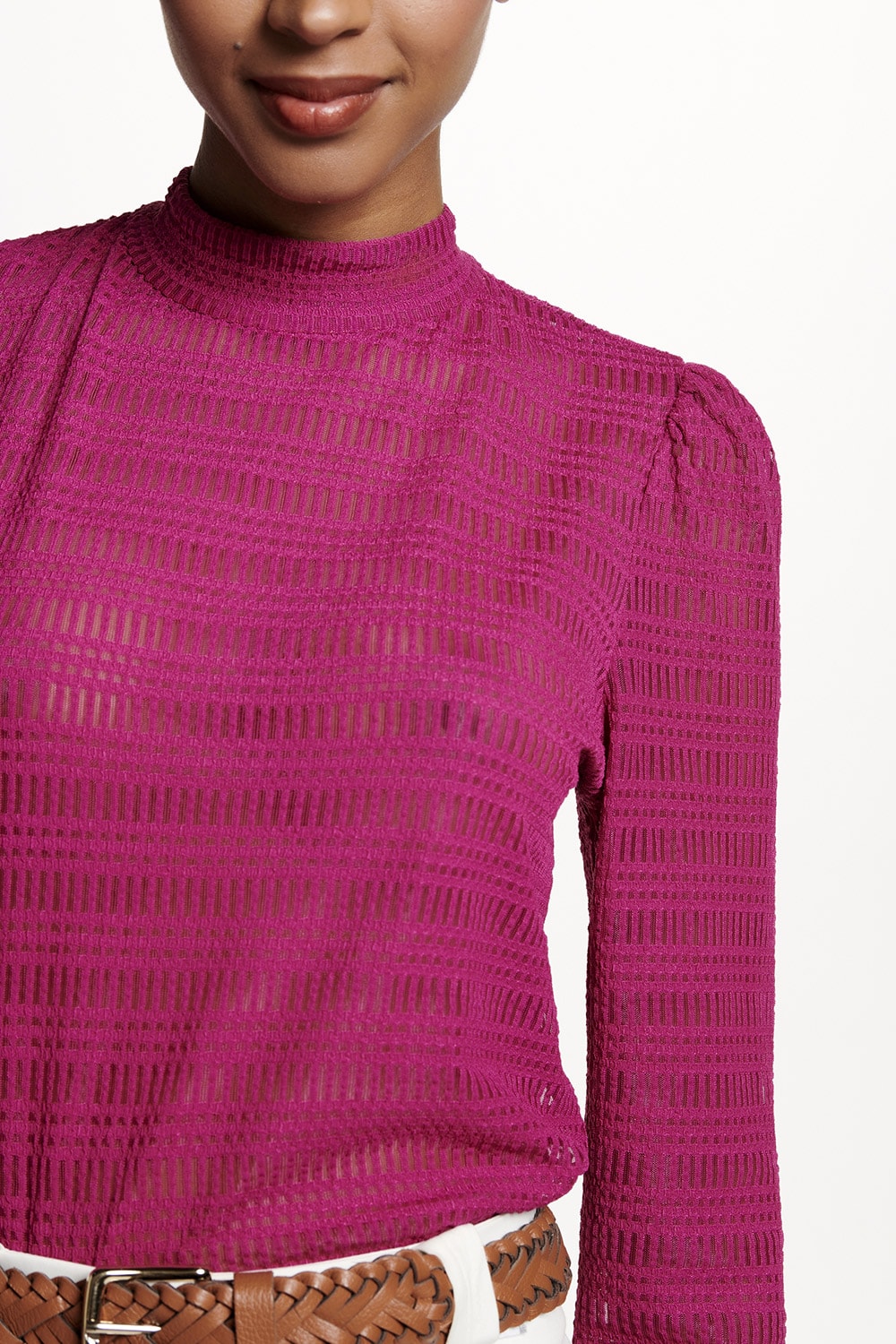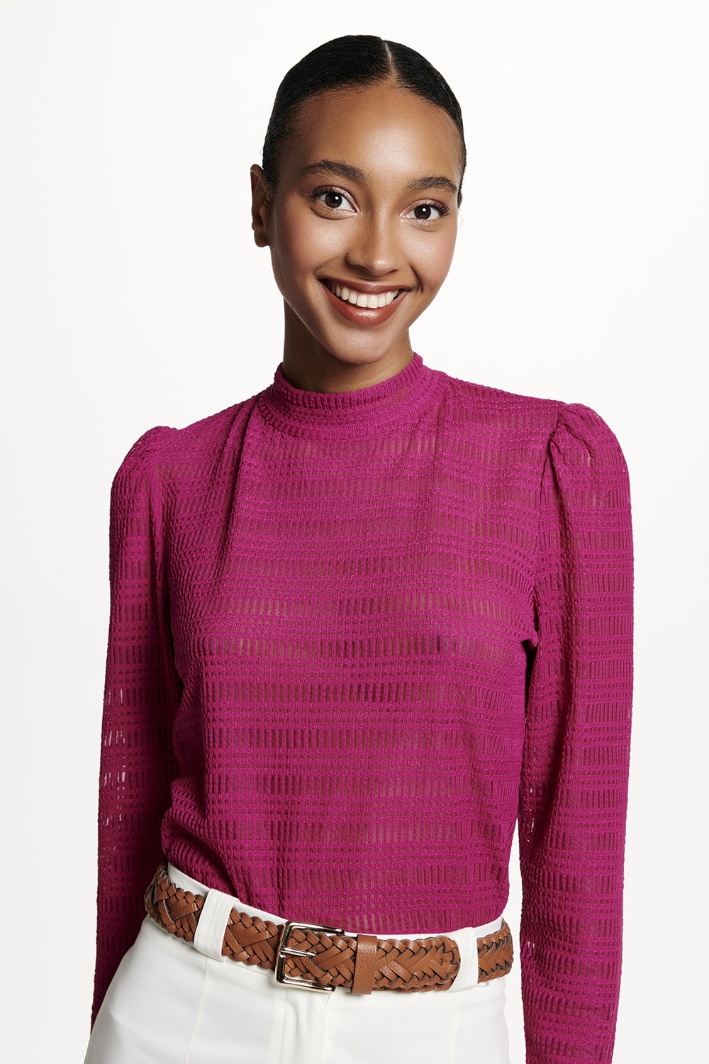 Blusa de gola alta e manga 3/4. É feita nesta linda malha, tecido tem leve transparência e modelagem muito feminina.