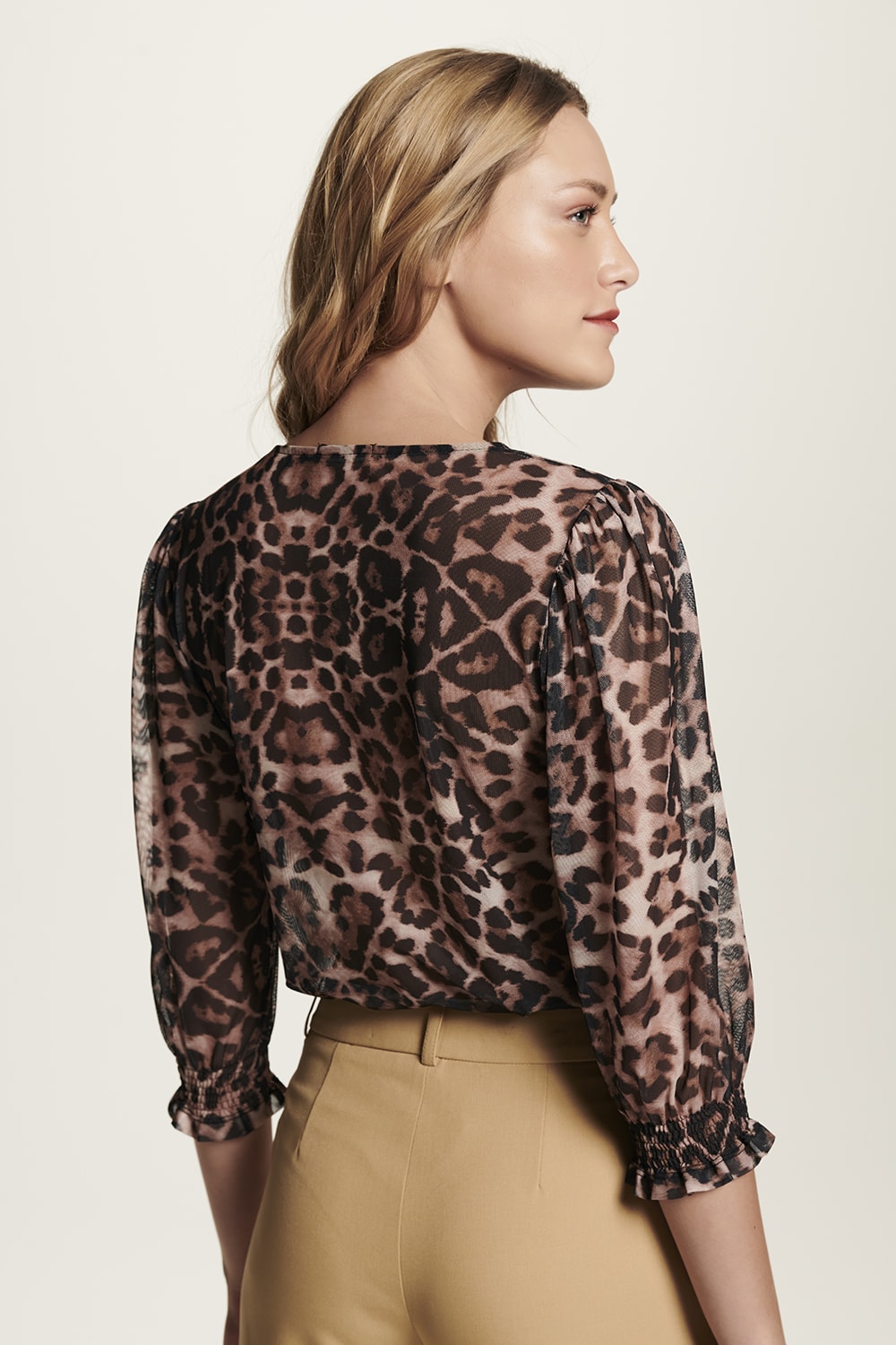 Para um look cheio de personalidade e estilo, a blusa de tule vem em uma linda estampa animal print.