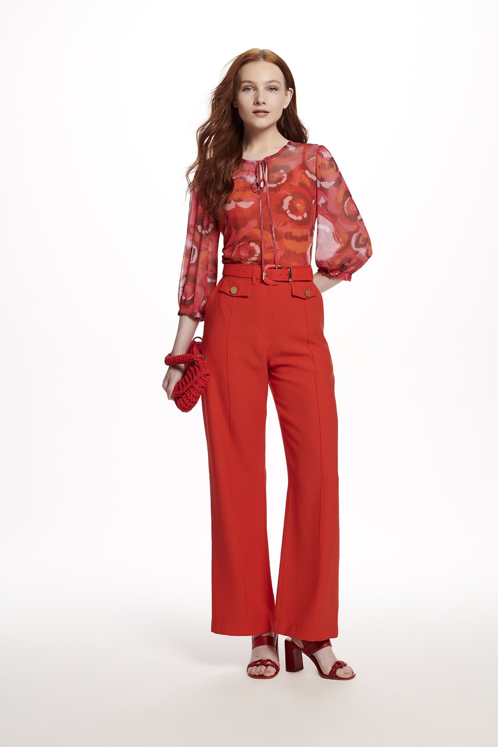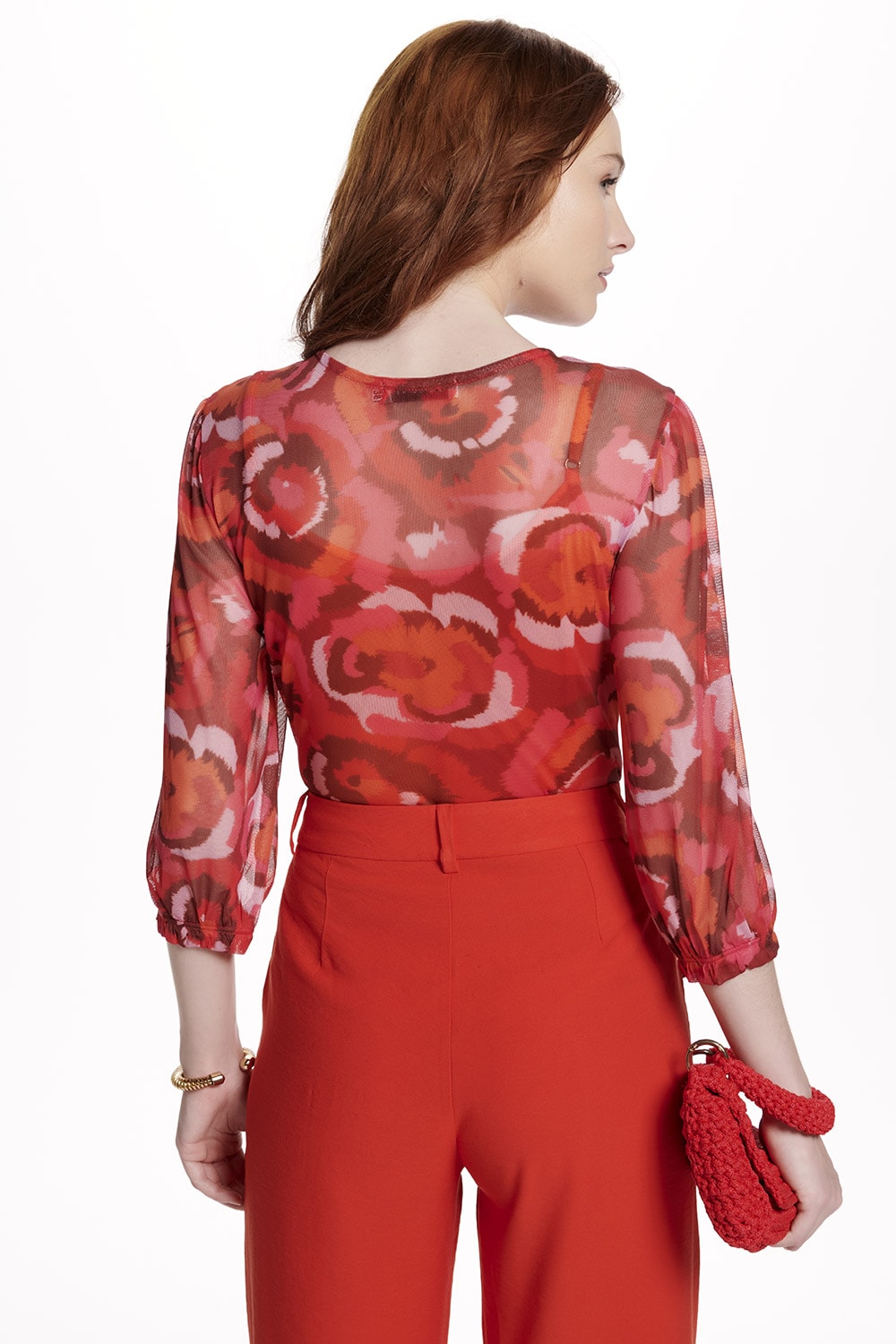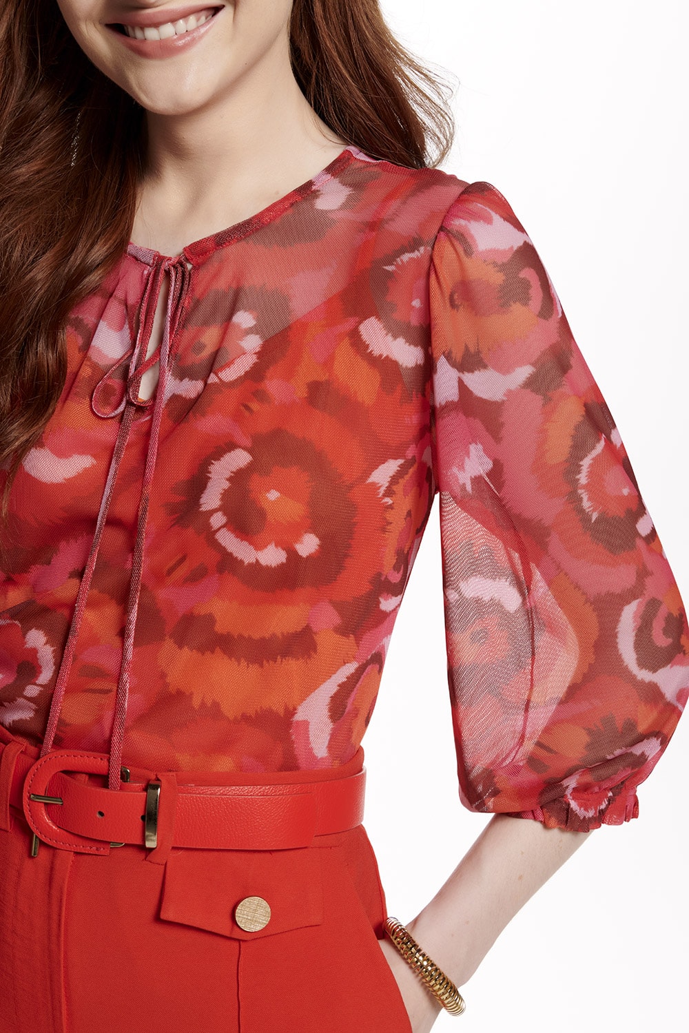 Blusa em tule estampado, modelo decote redondo com abertura e amarração, manga 7/8 com detalhe franzido e elástico. Ideal combinação com um jeans.