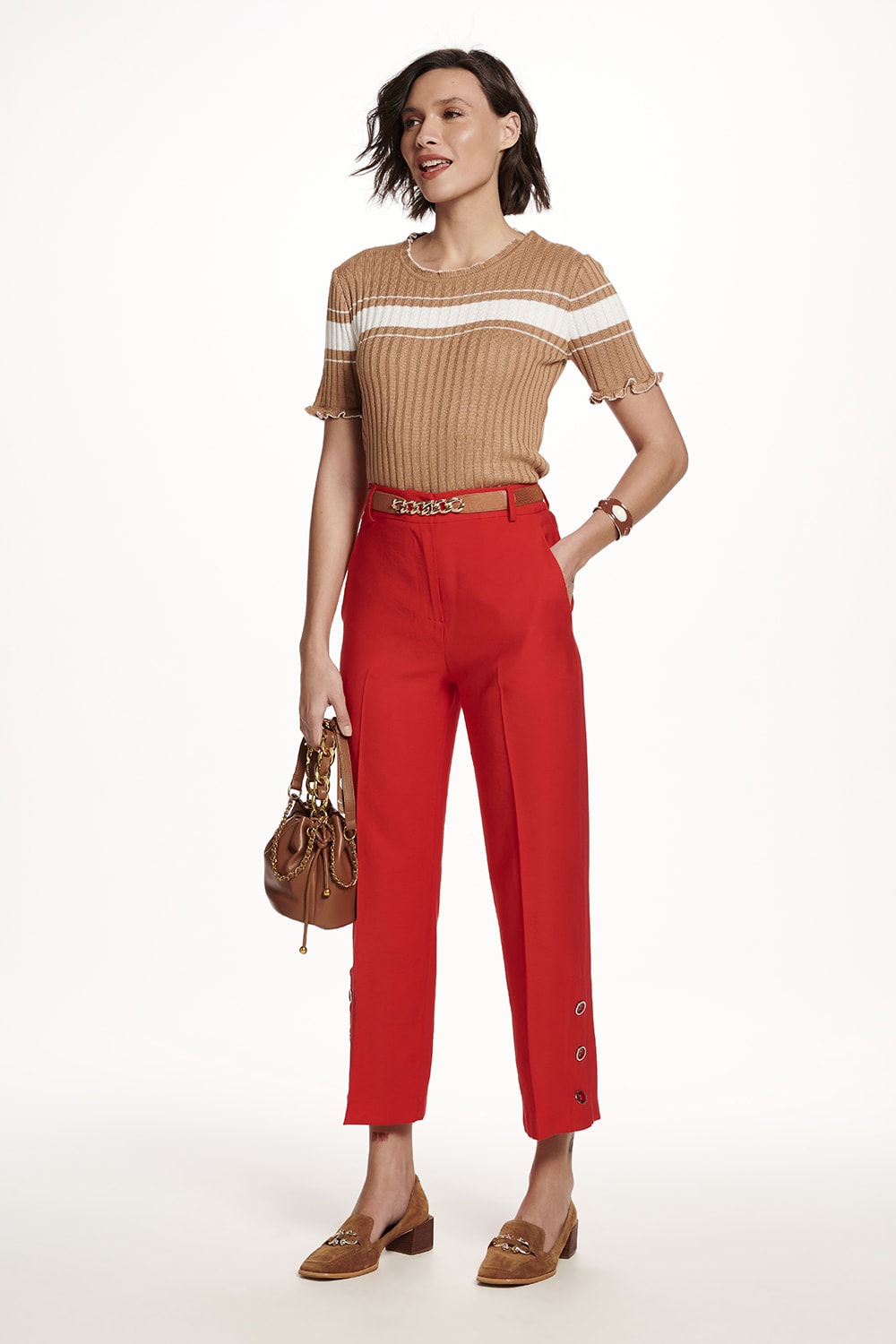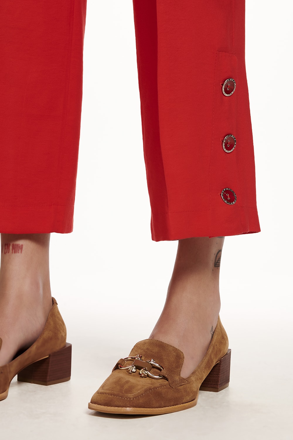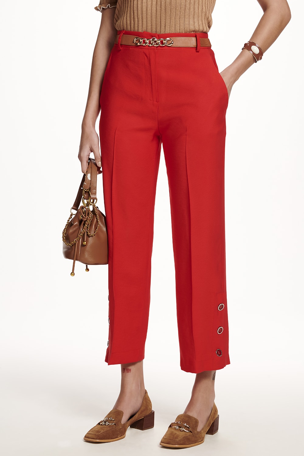Calça em alfaiataria, tem modelagem reta, cós com passantes, bolso faca e detalhes com botões nas pernas, próximos a barra. Elegante e clássica para qualquer ocasião.