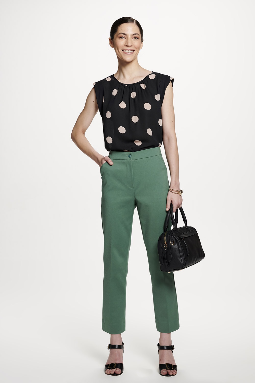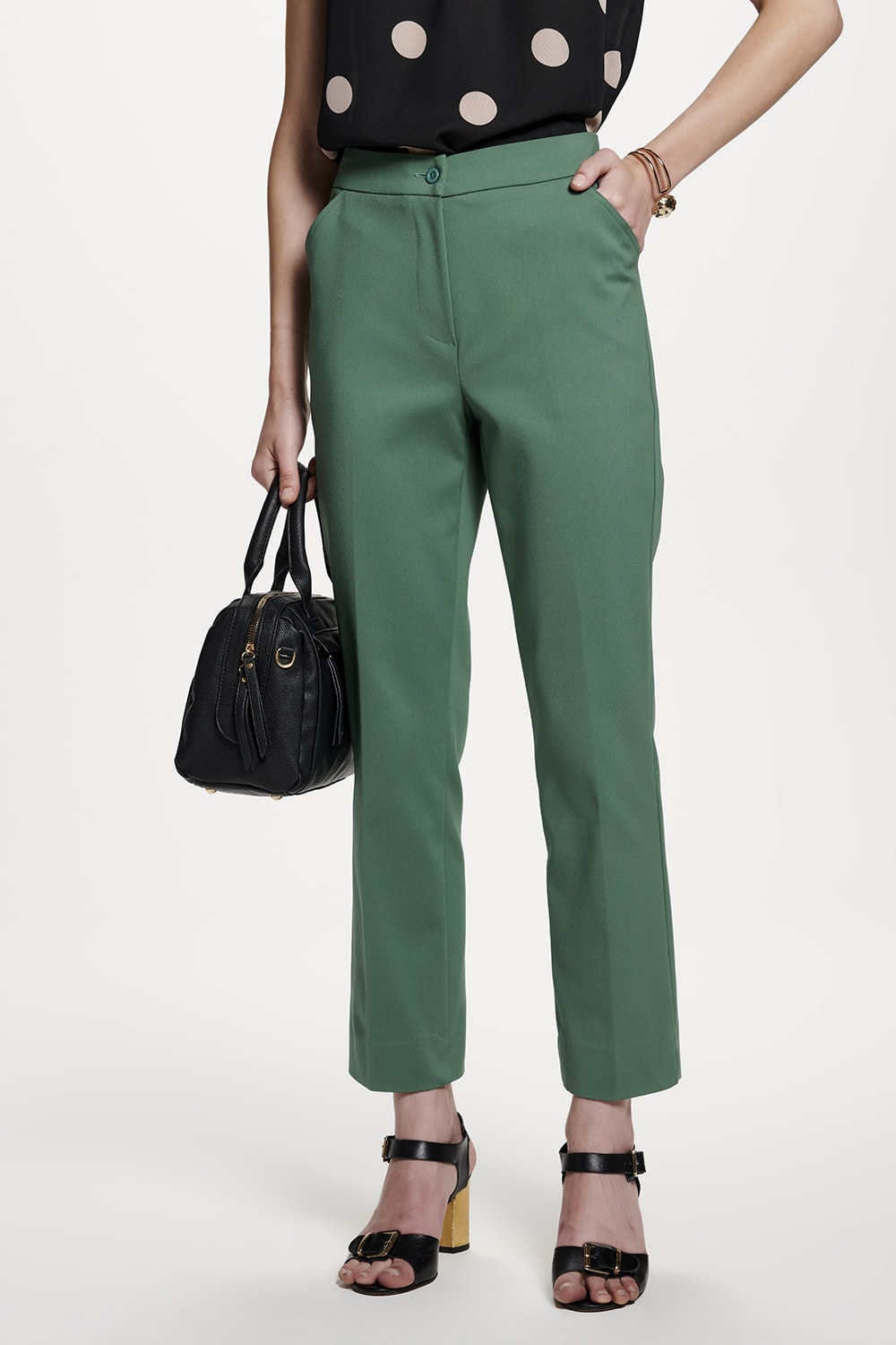 Um clássico do guarda roupa feminino, a calça cigarrete foi confeccionada em tecido encorpado de algodão com elastano, proporcionando maior conforto.