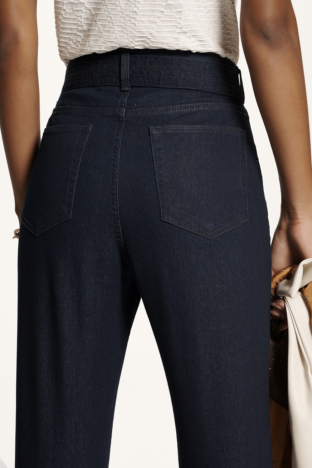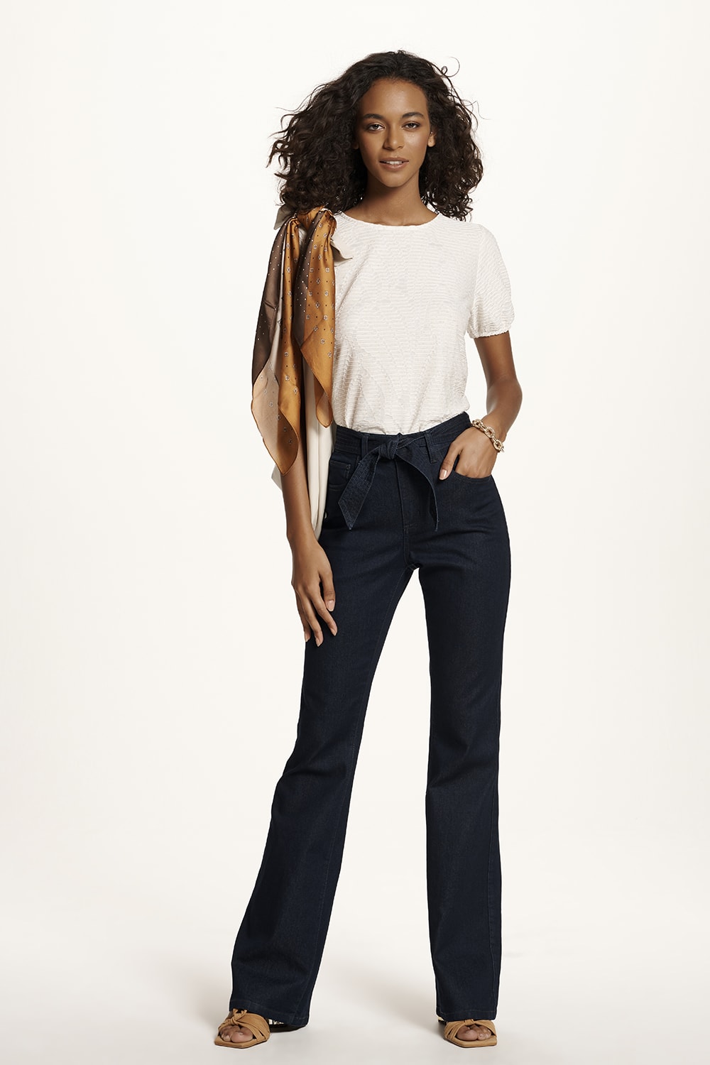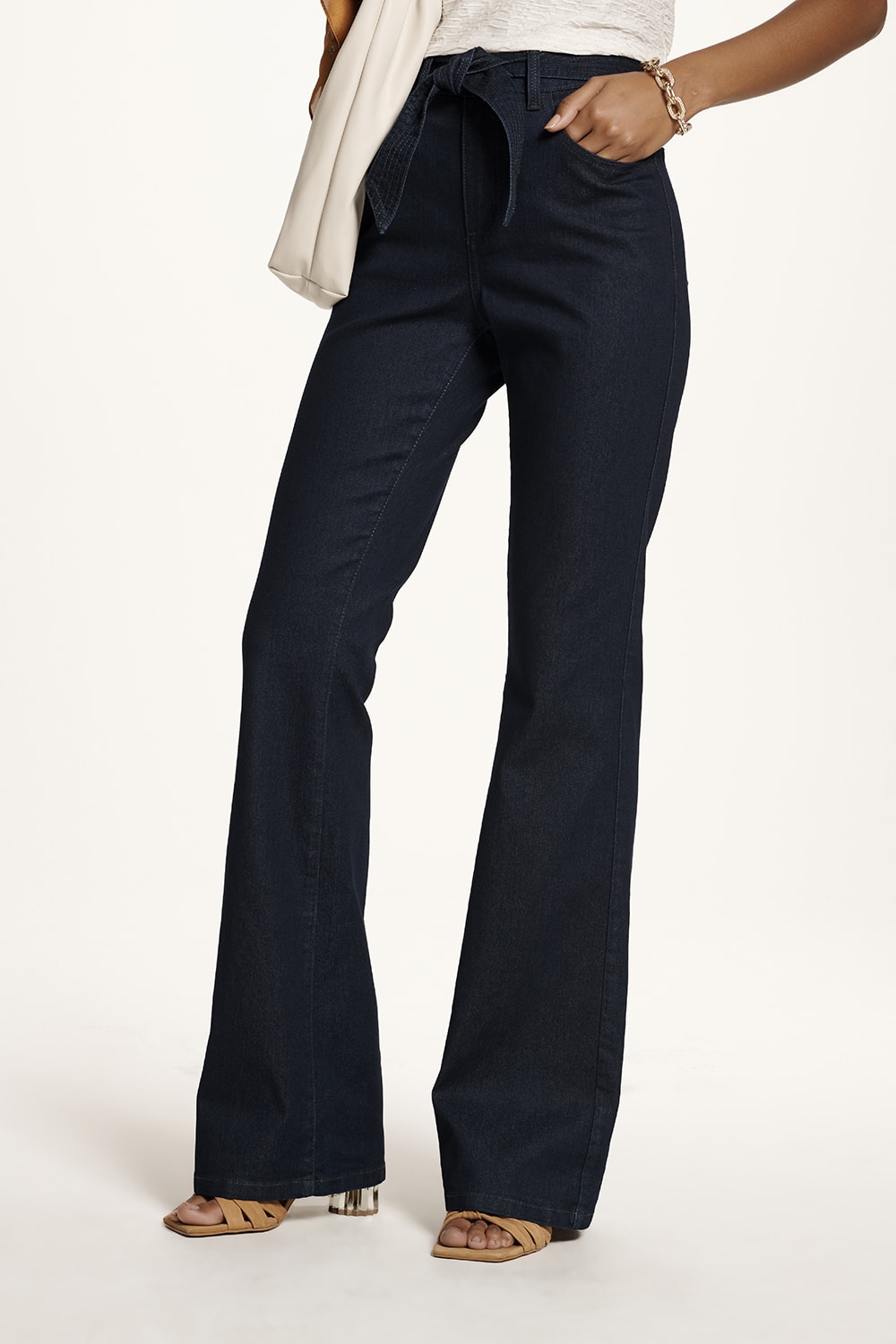 Calça jeans modelo flare, cintura alta, cinto para amarração e lavagem azul jeans. Confortável e elegante para o dia a dia.