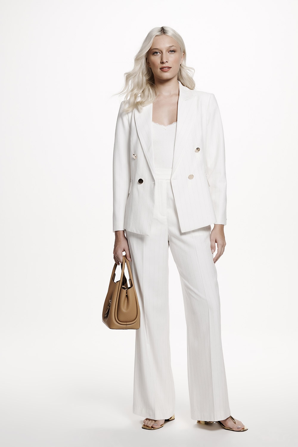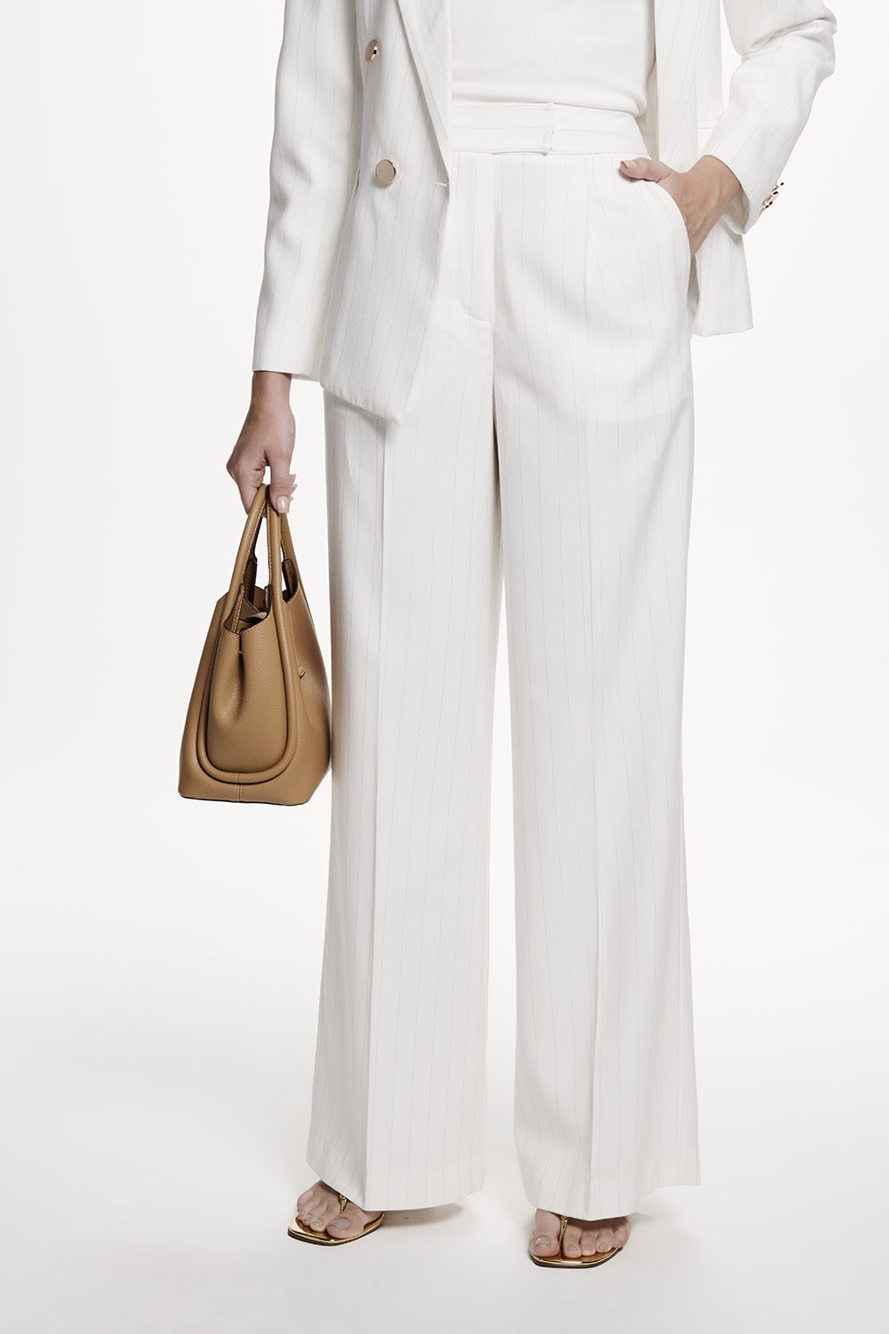 Calça em tecido risca de giz de fios de lurex dourado e modelagem de pernas retas. É um modelo clássico e cheio de charme por conta desse tecido especial.