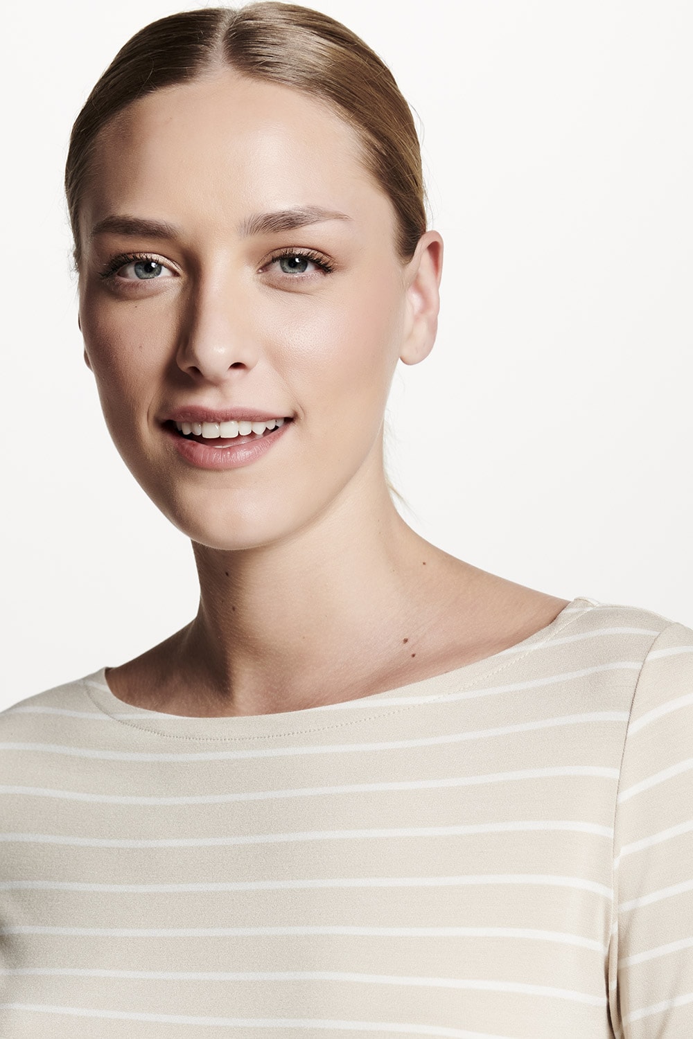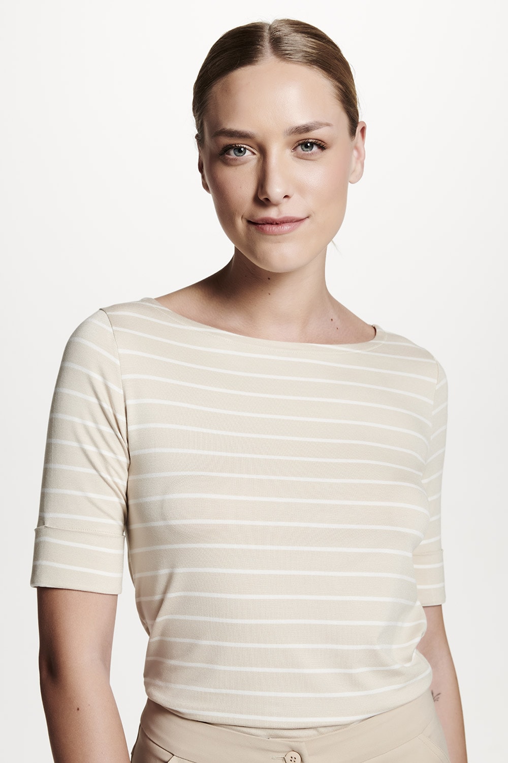 Blusa elegante em malha listrada com um corte ajustado ao corpo, este modelo tem decote canoa e mangas 3/4 que adicionam um toque de sofisticação. Ideal para ocasiões casuais ou até mesmo um look poderoso e profissional.