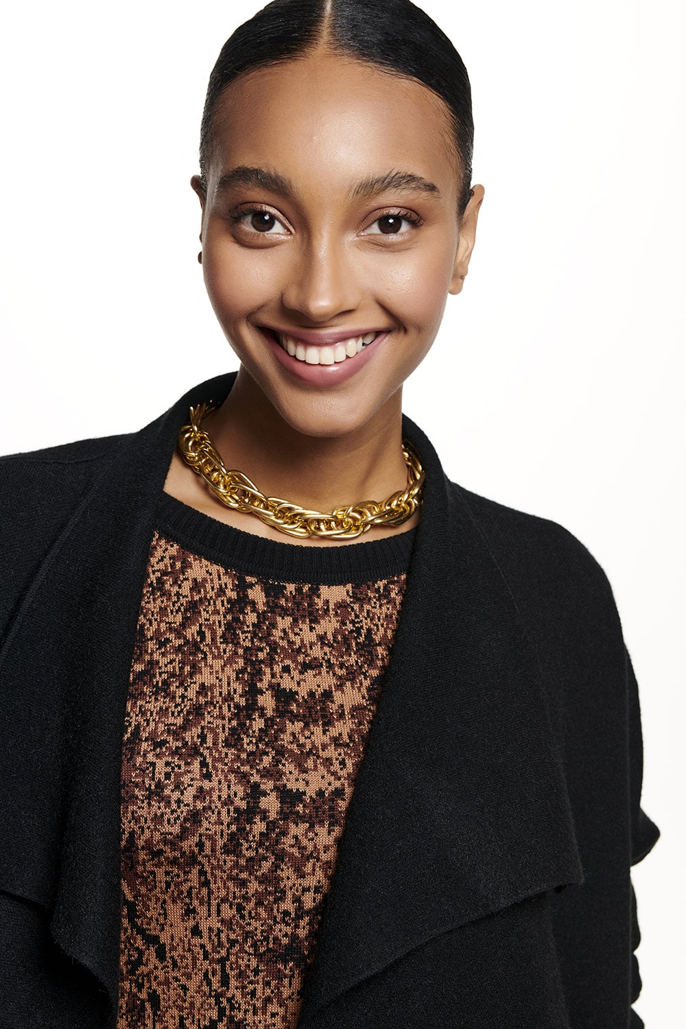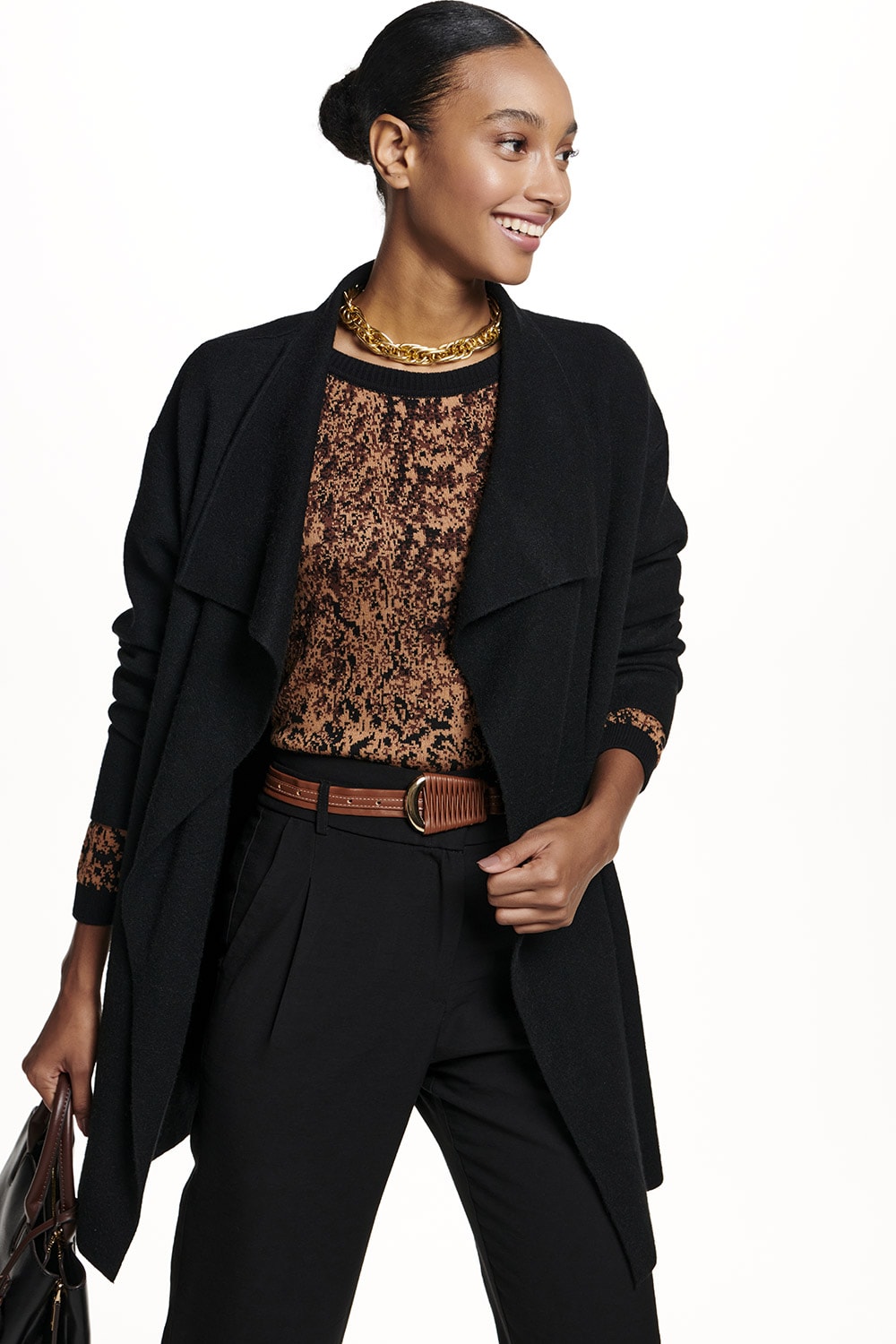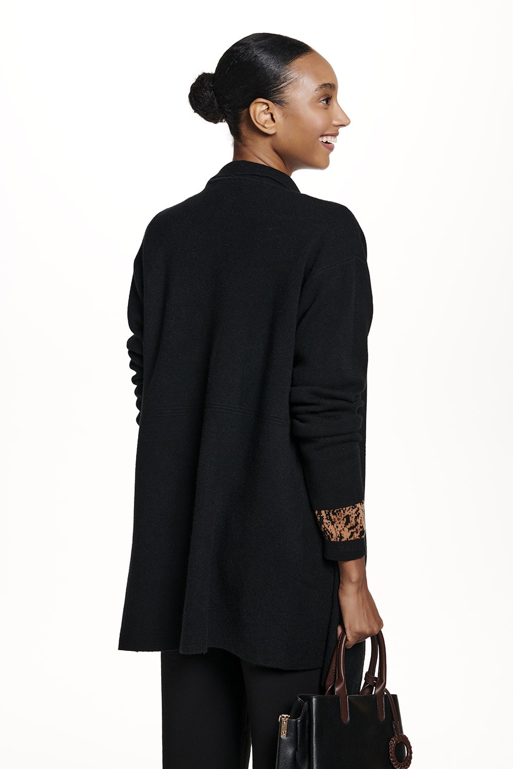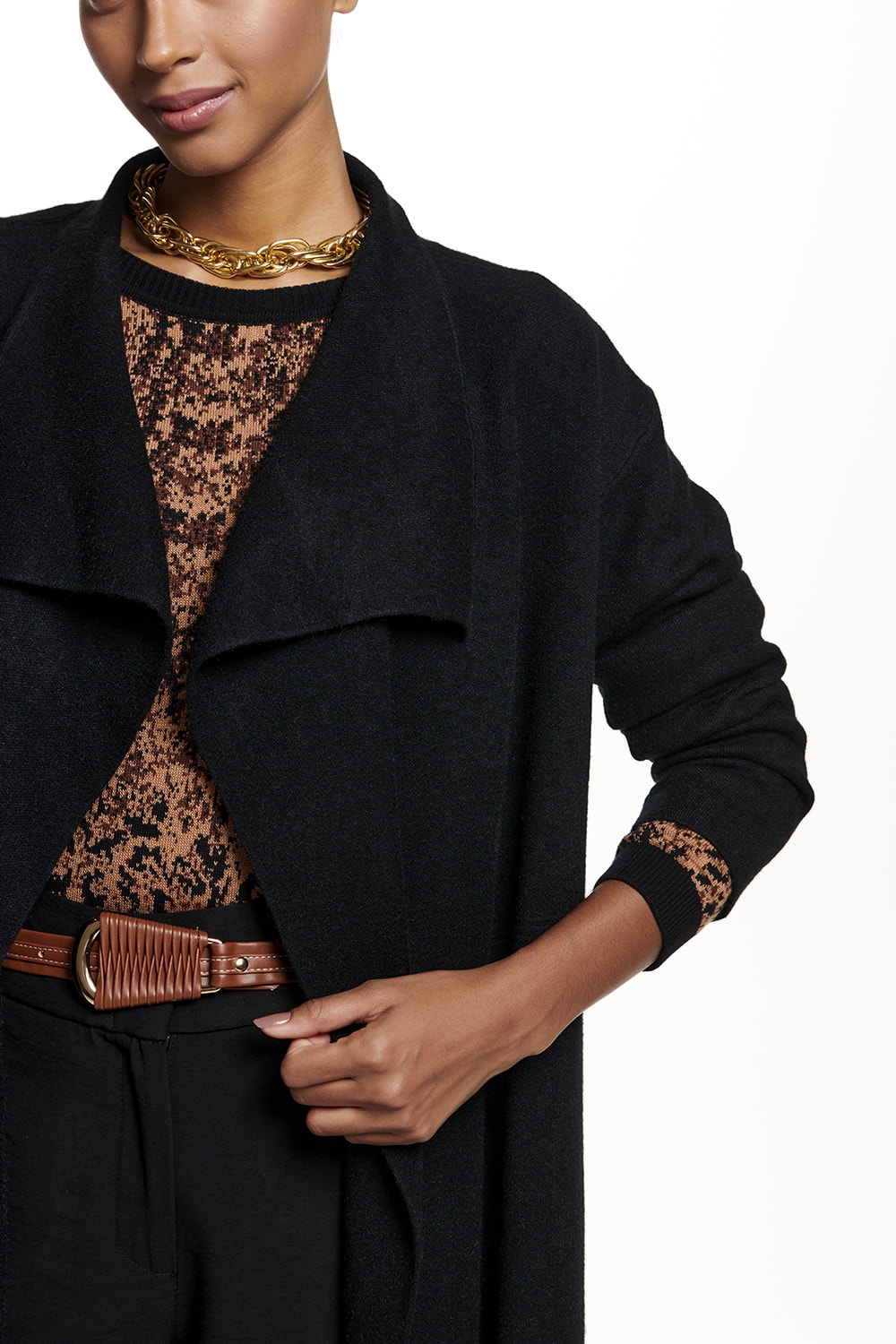 Casaco em tricot com gola degradê e comprimento que cobre o quadril.