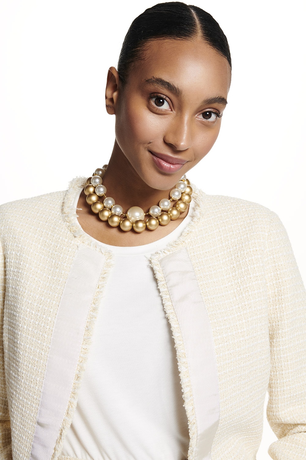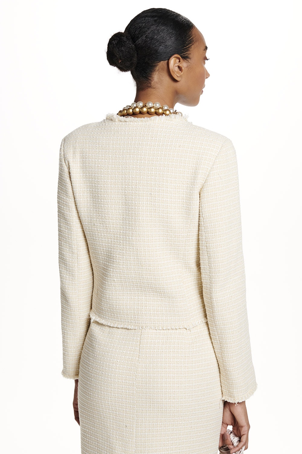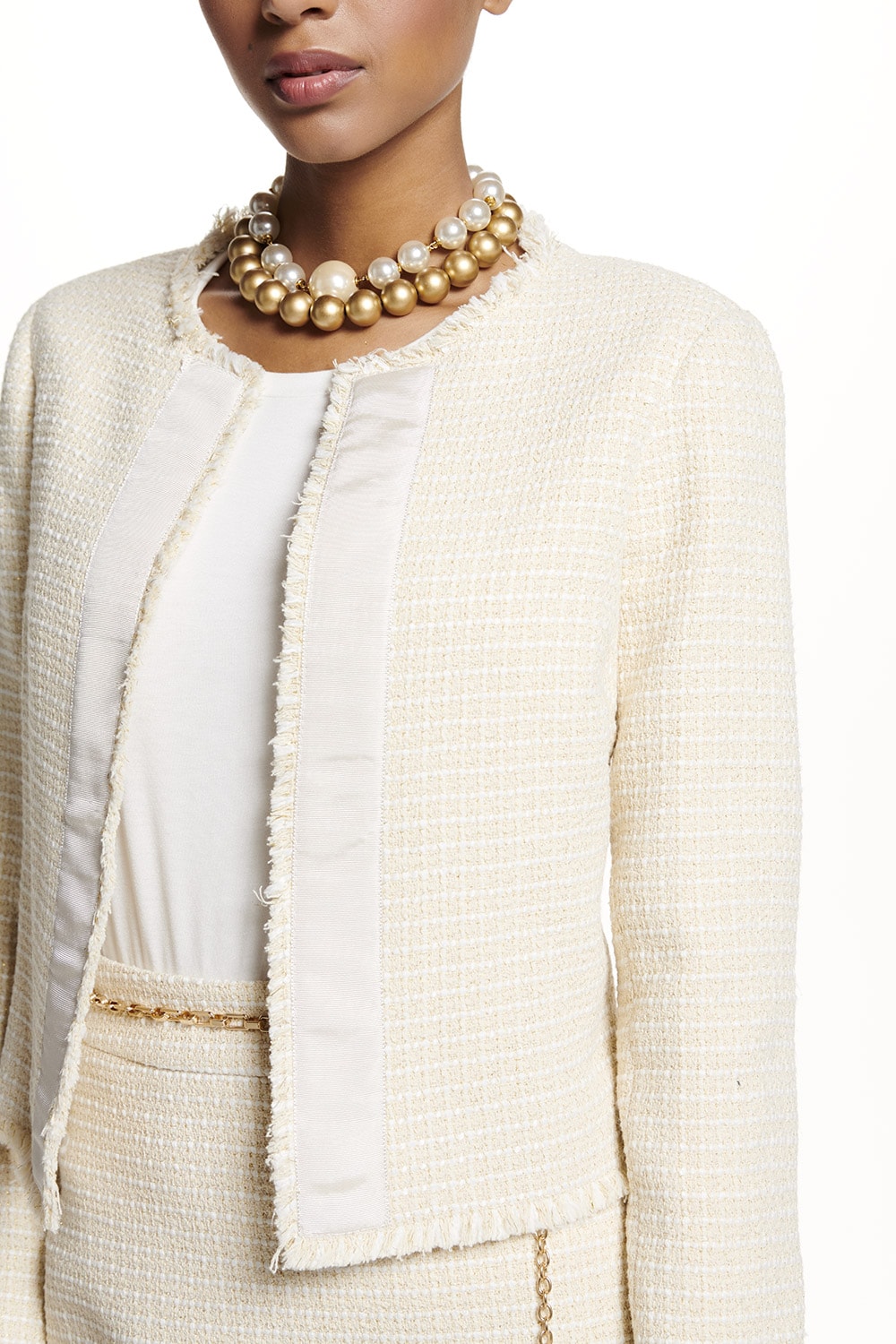 Casaqueto em tweed, modelo sem gola, aplicação e aviamento na frente com detalhes desfiados. Ideal combinação com a referência: