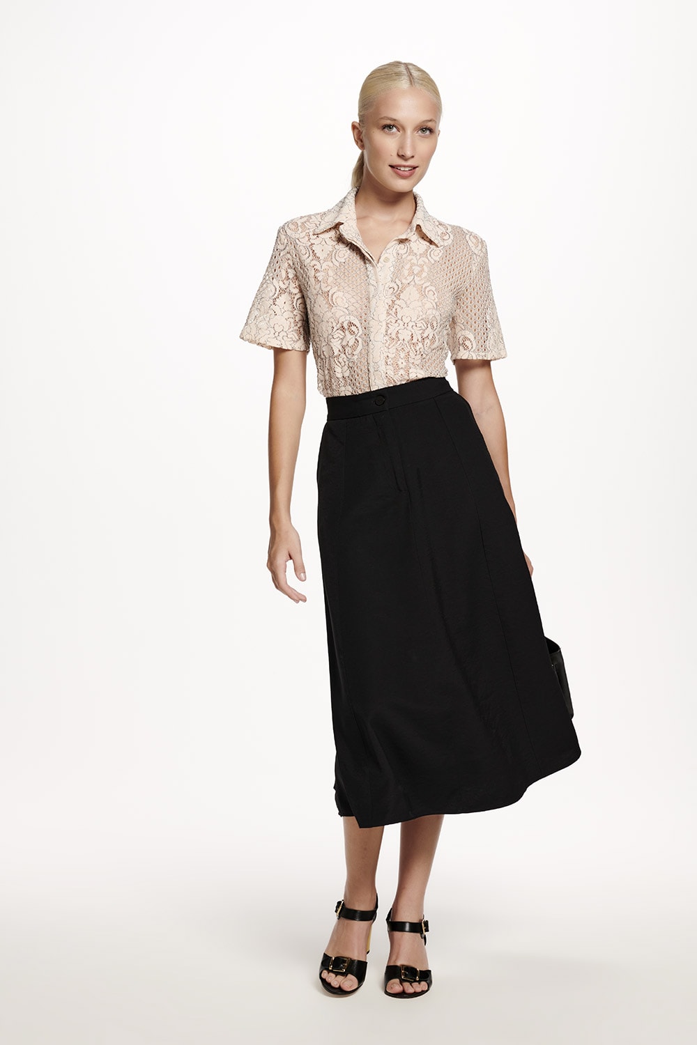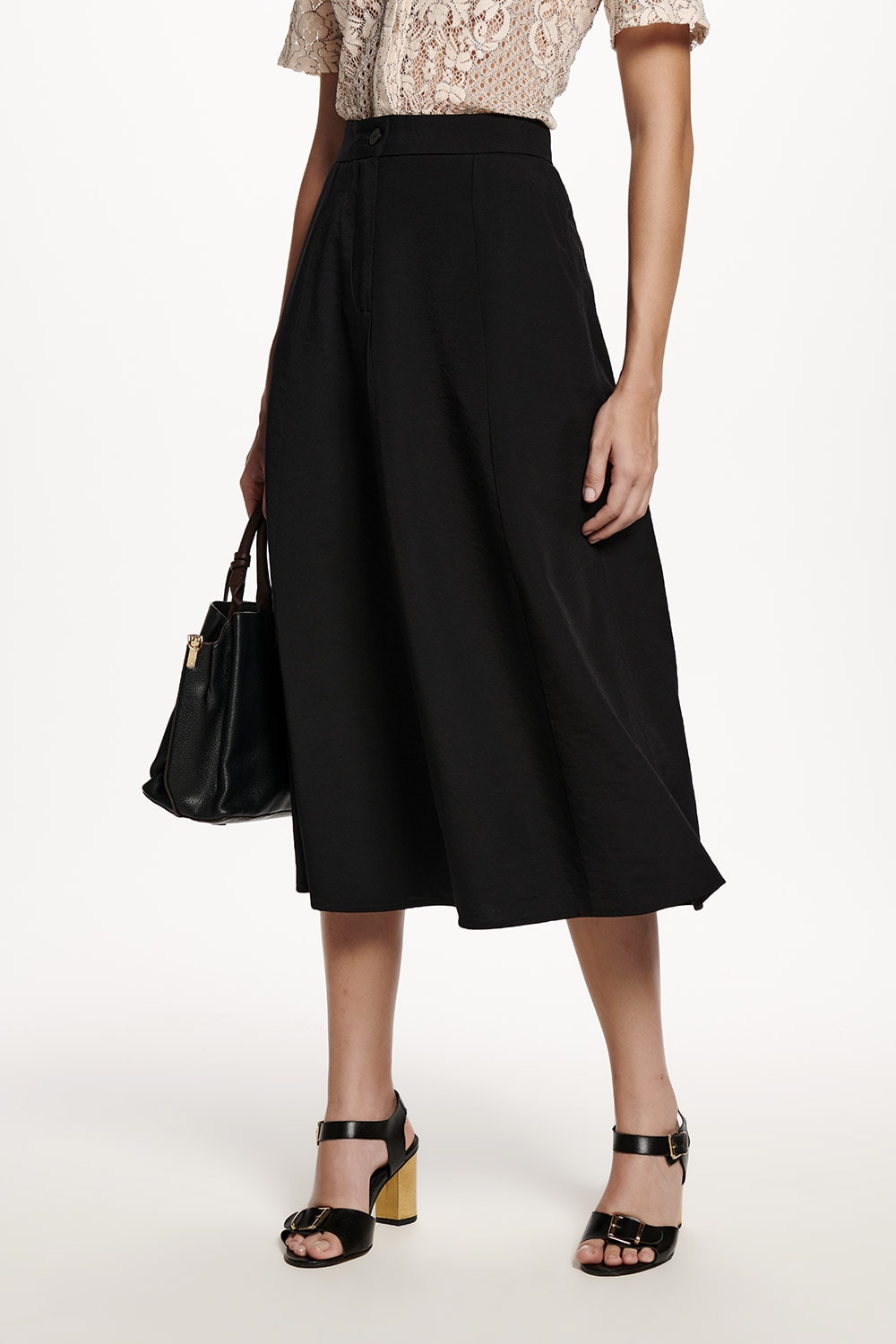 Saia evasê com bolso faca, tem vista com zíper e botão em linda cor.