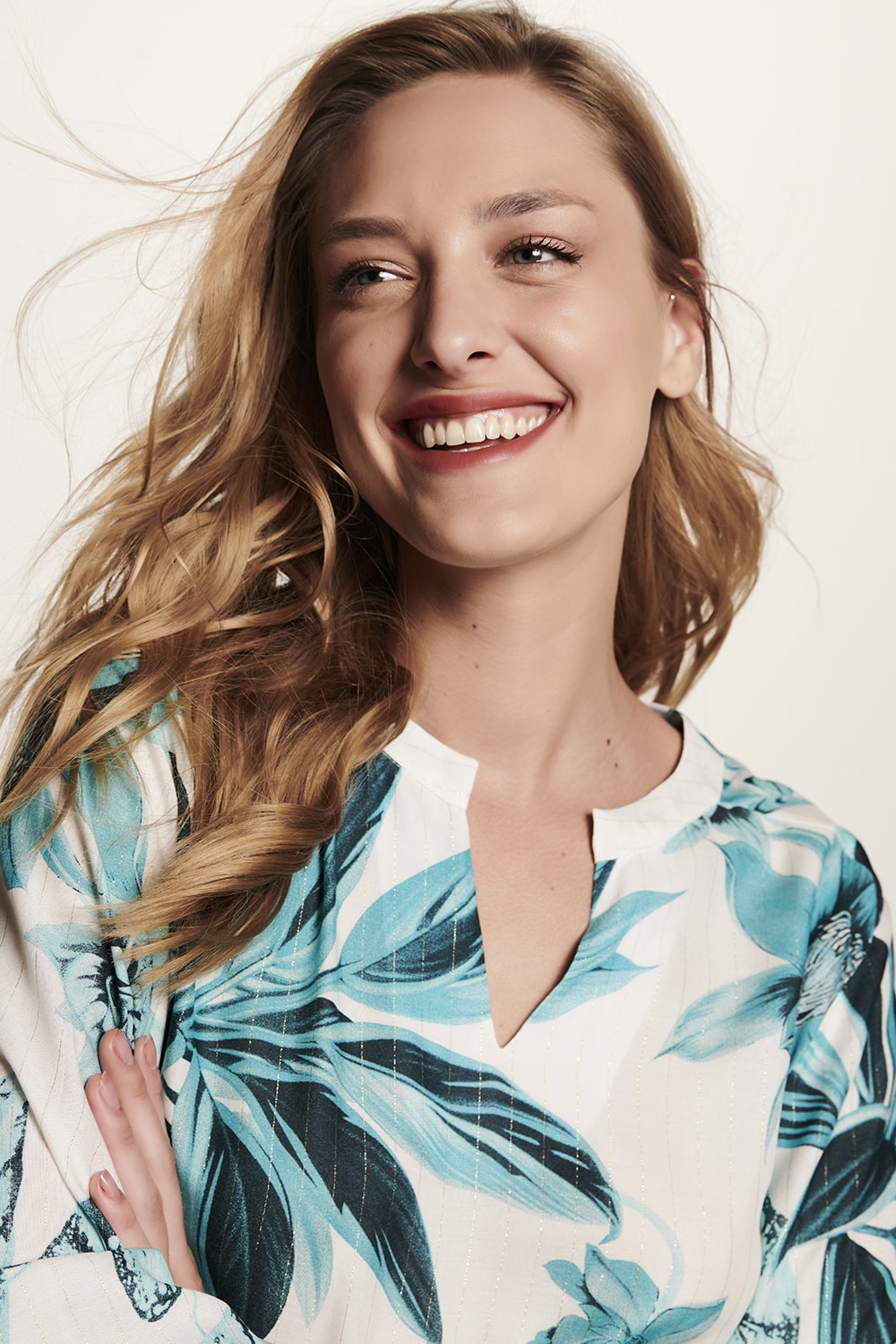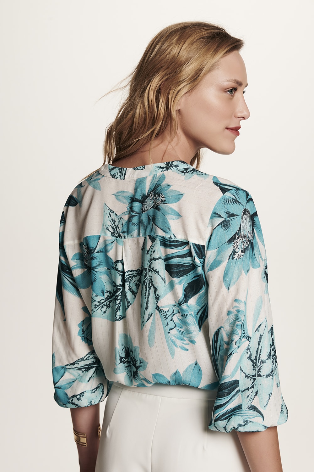 Túnica em estampa exclusiva com detalhe metálico, tem decote com pé de gola e manga com elástico.