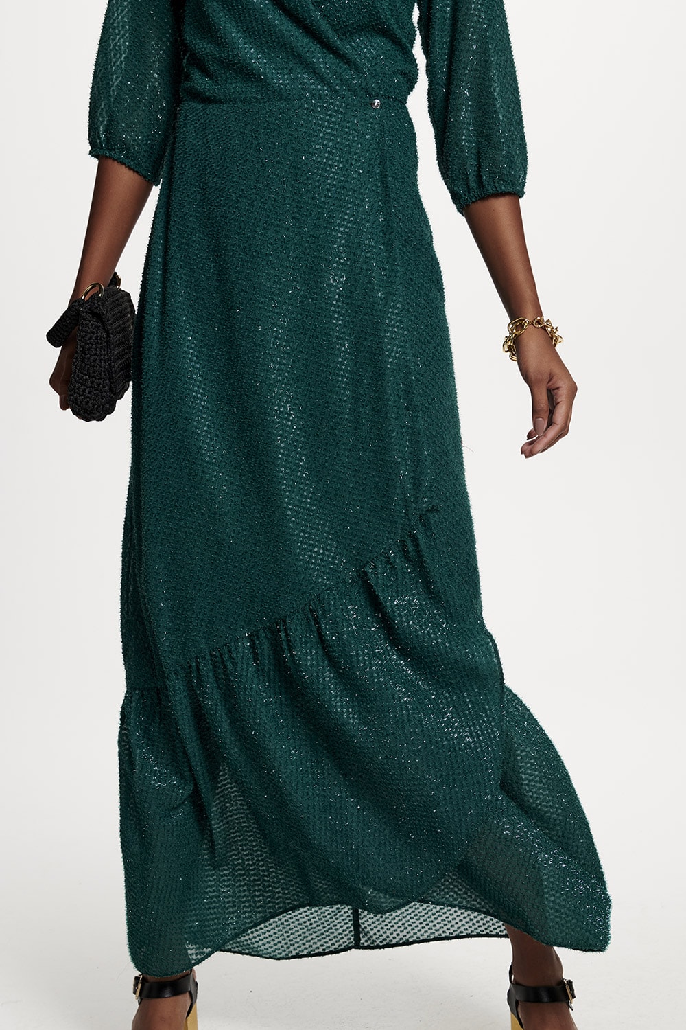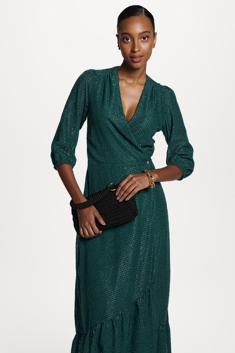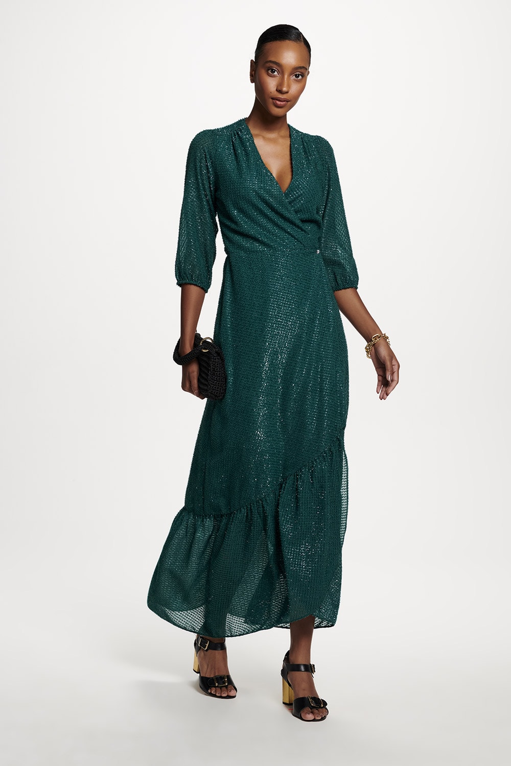 Vestido com detalhe em brilho leve tem decote transpassado e saia com lindo babado.
