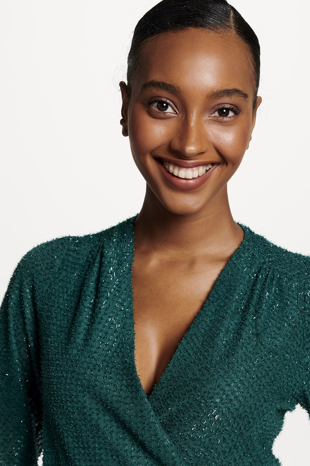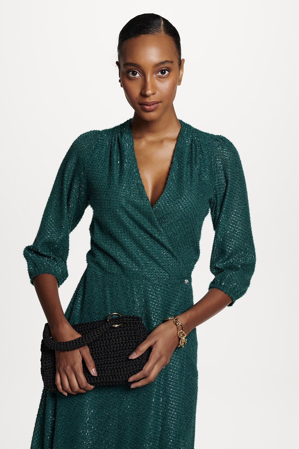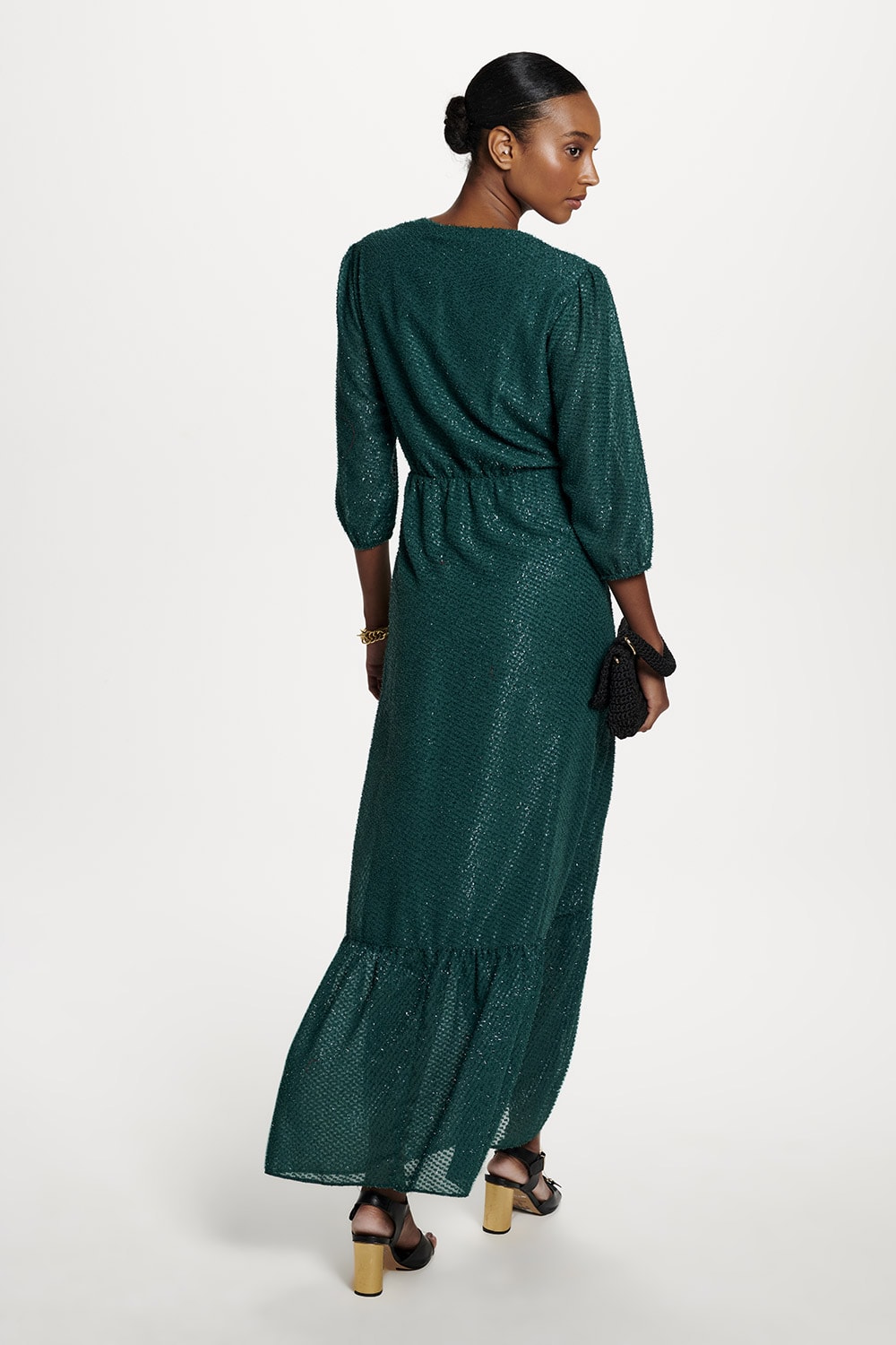 Vestido com detalhe em brilho leve tem decote transpassado e saia com lindo babado.