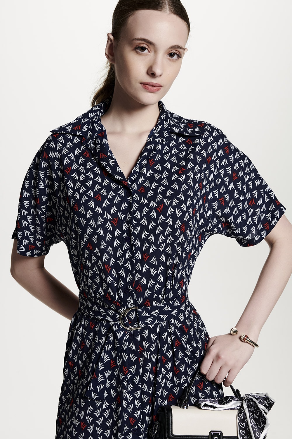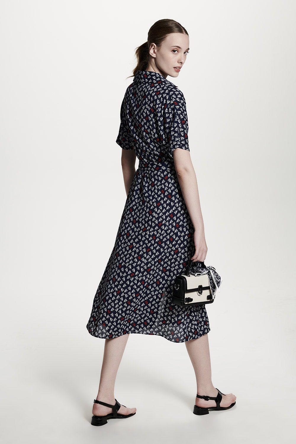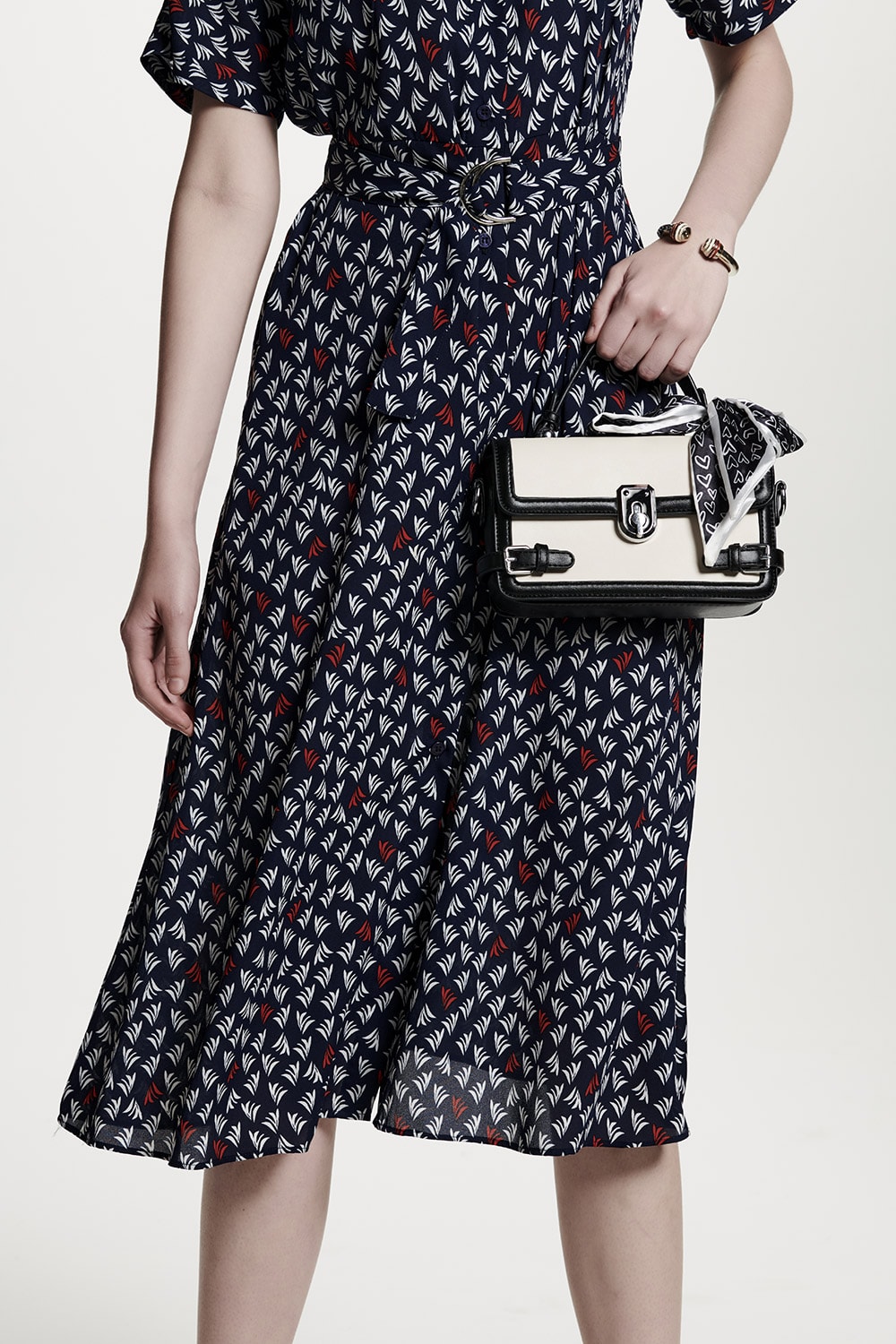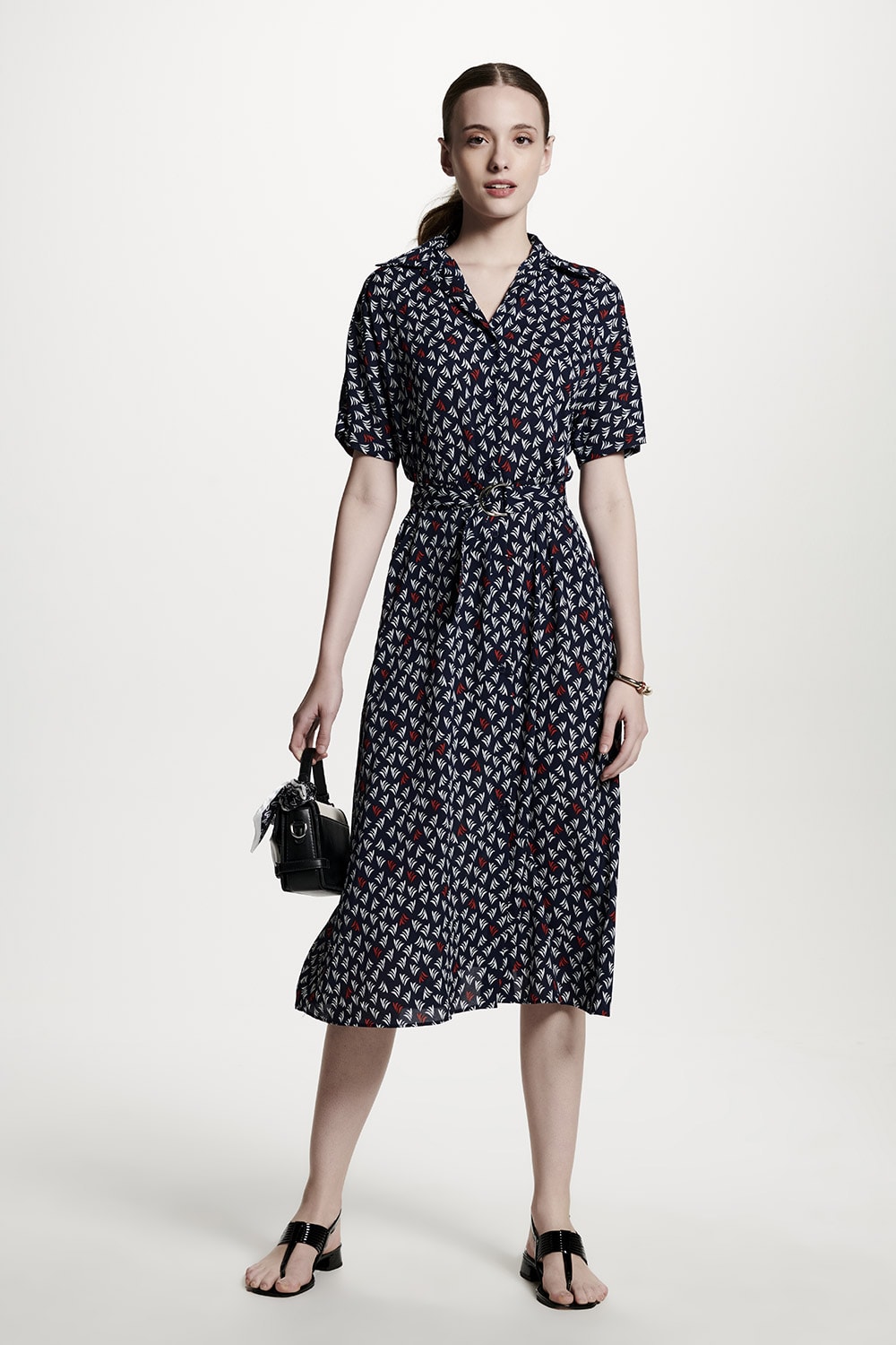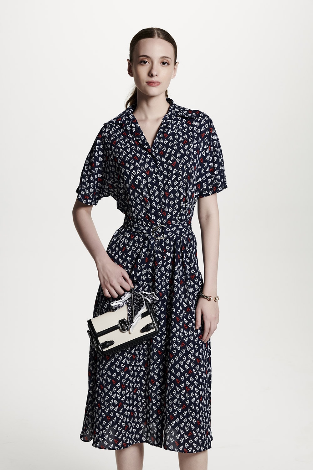 Vestido midi com estampa delicada, tem cinto no mesmo tecido com fivela e shepe evasê super feminino.