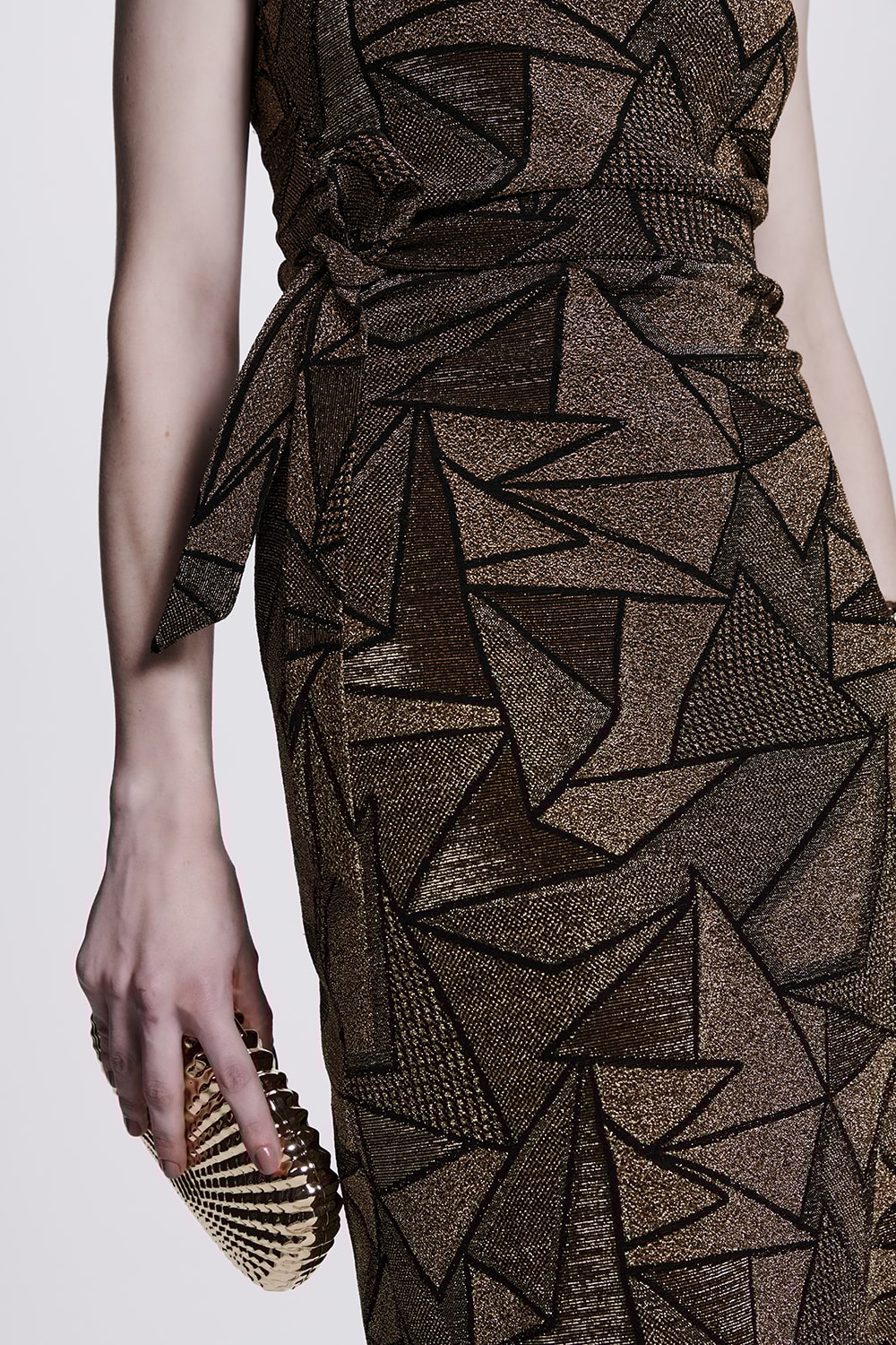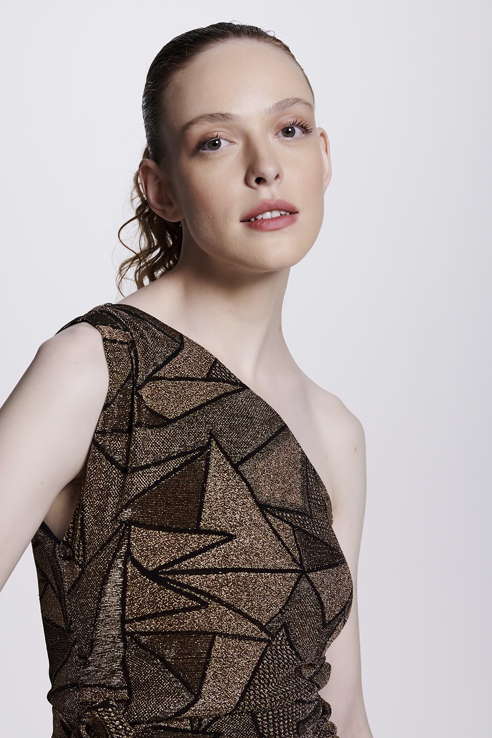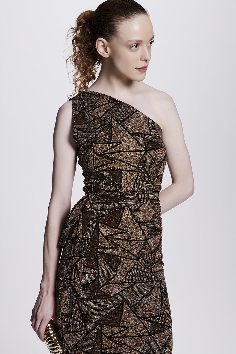 Vestido em malha lurex de um ombro só. Com lindo desenho abstrato e comprimento midi é elegante e pode ser usado em ocasiões especiais.