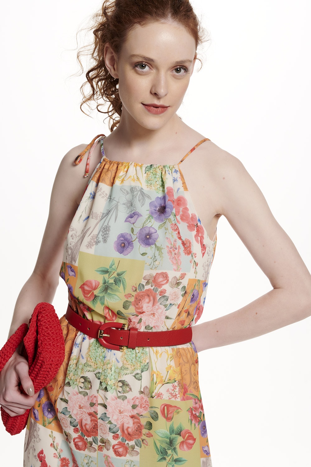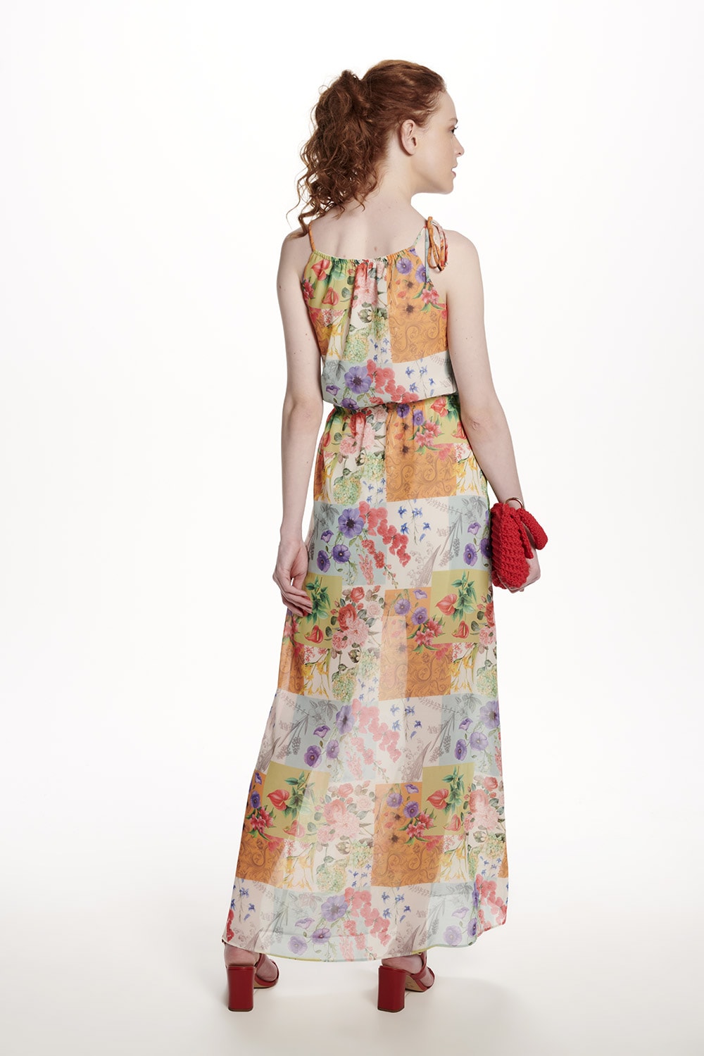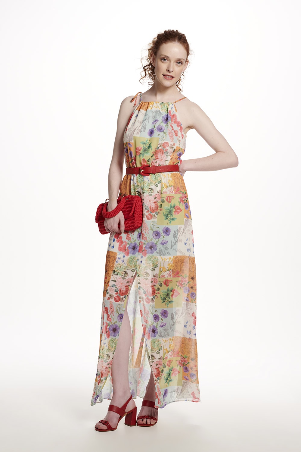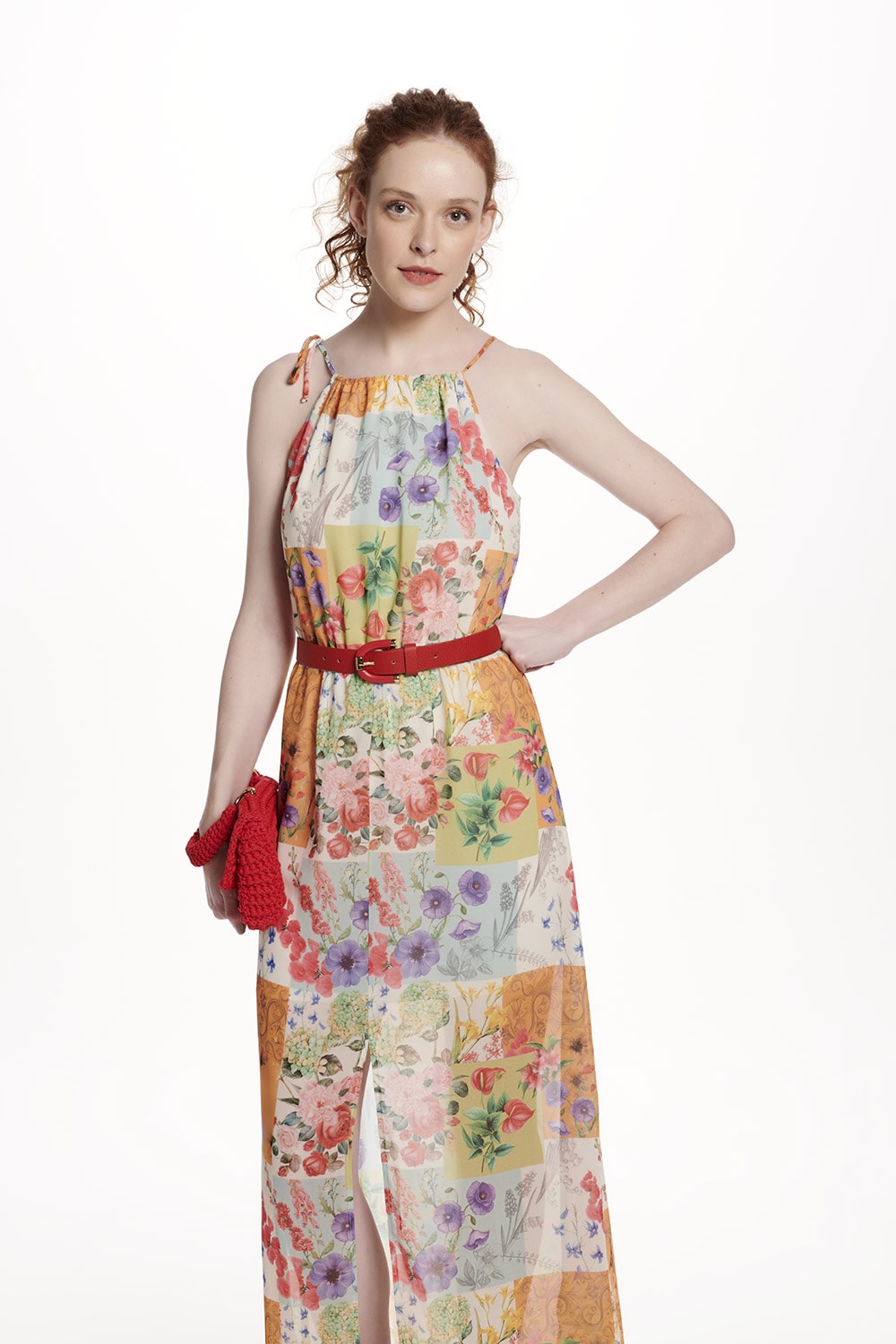 Vestido com estampa exclusiva tem cordão no decote e elástico na cintura deixando-o alongado e linda fenda frontal dando um ar feminino ao look.