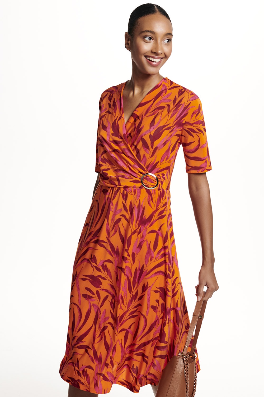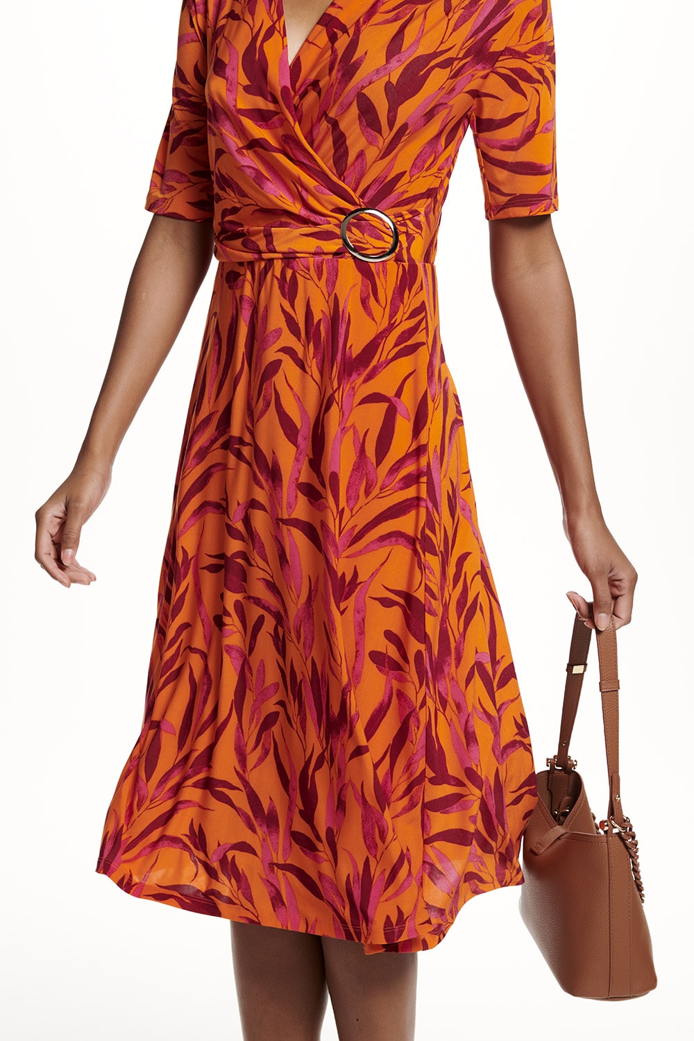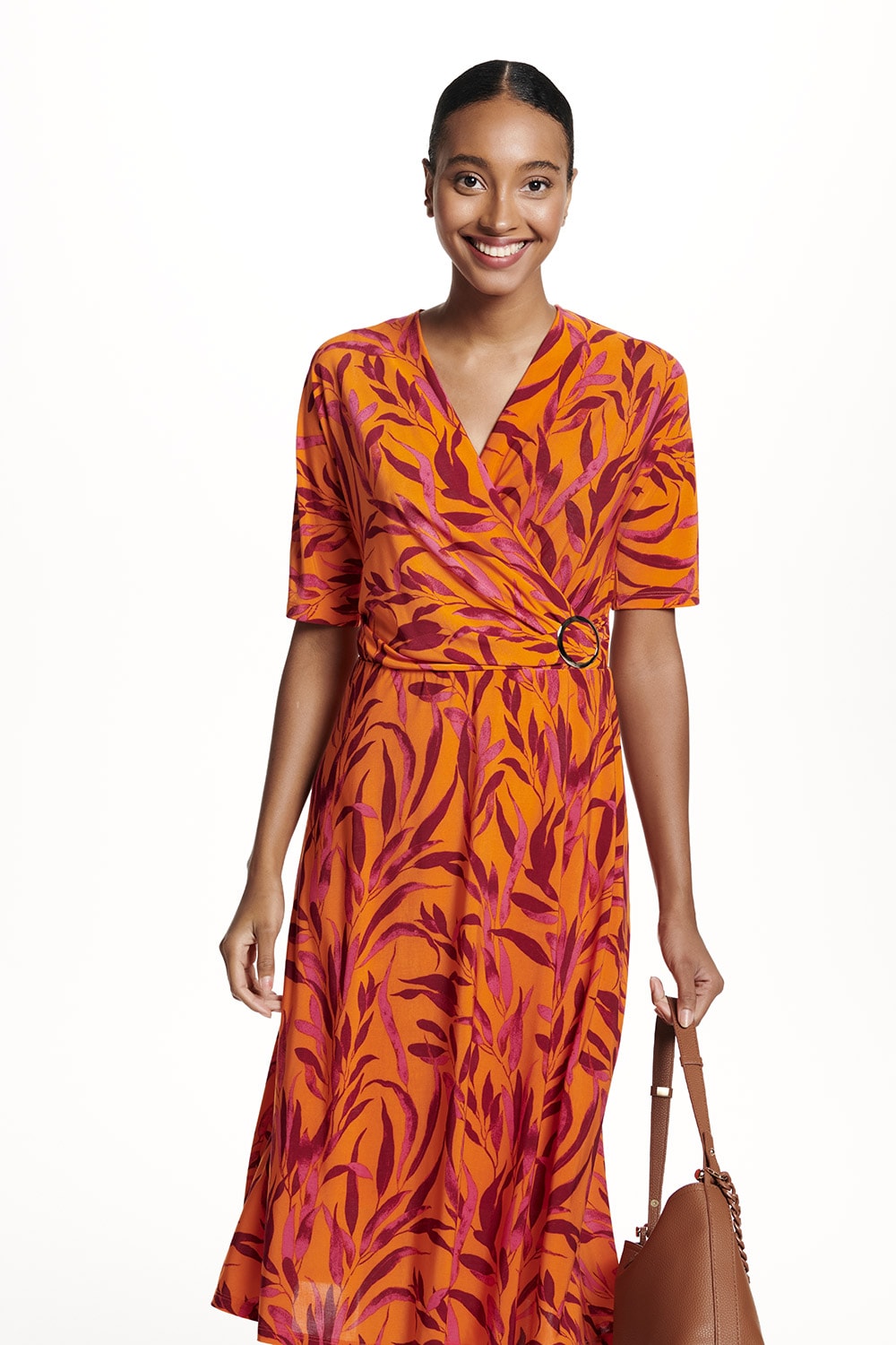 Vestido midi em malha fria estampada, decote v transpassado com detalhe de fivela em metal e mangas 7/8. Clássica e elegante para qualquer ocasião.