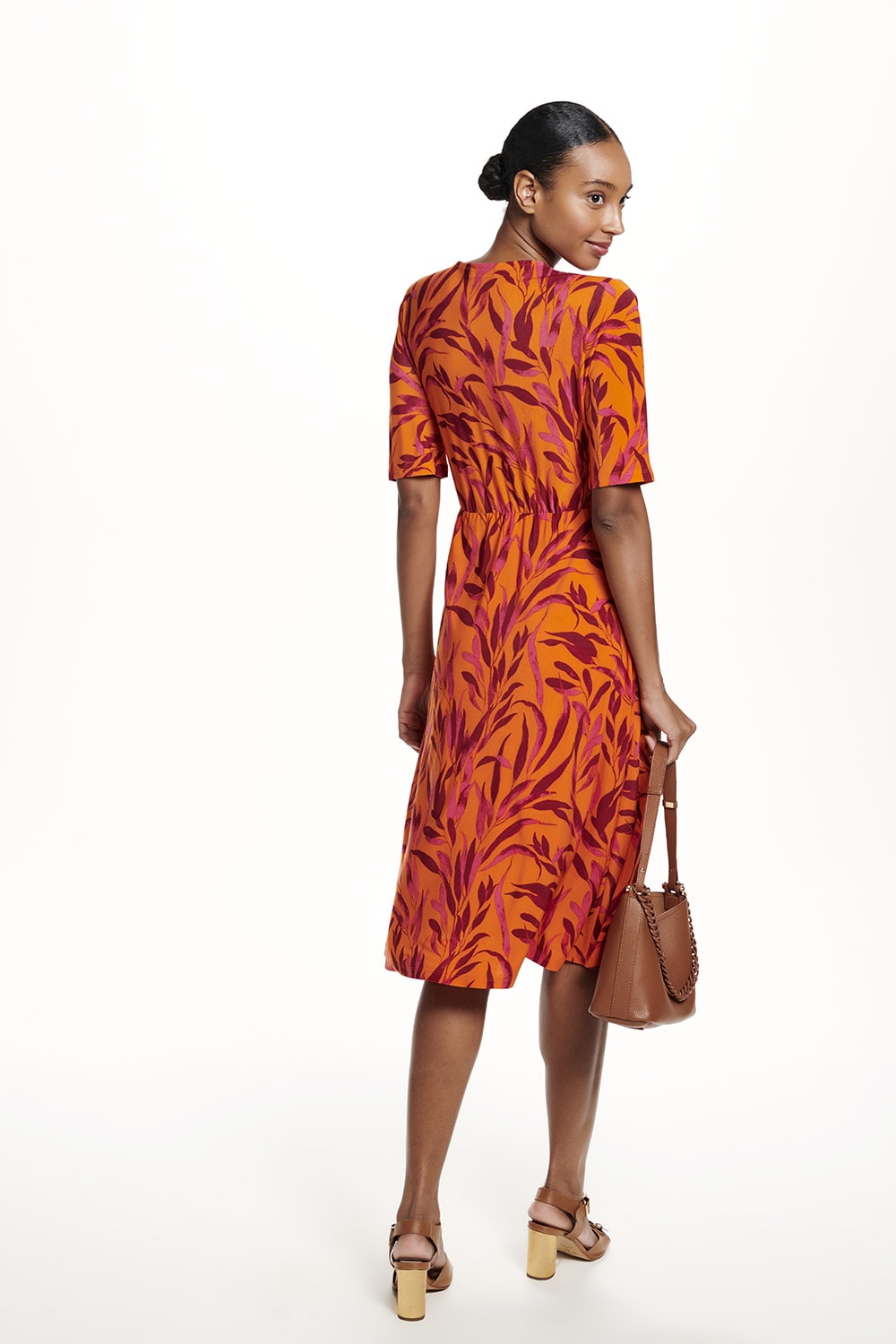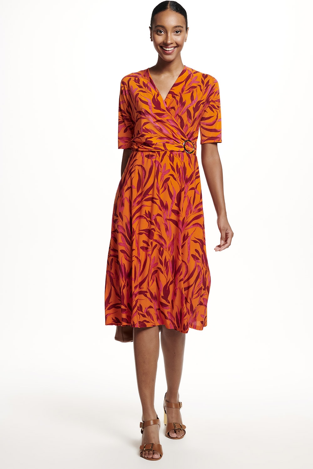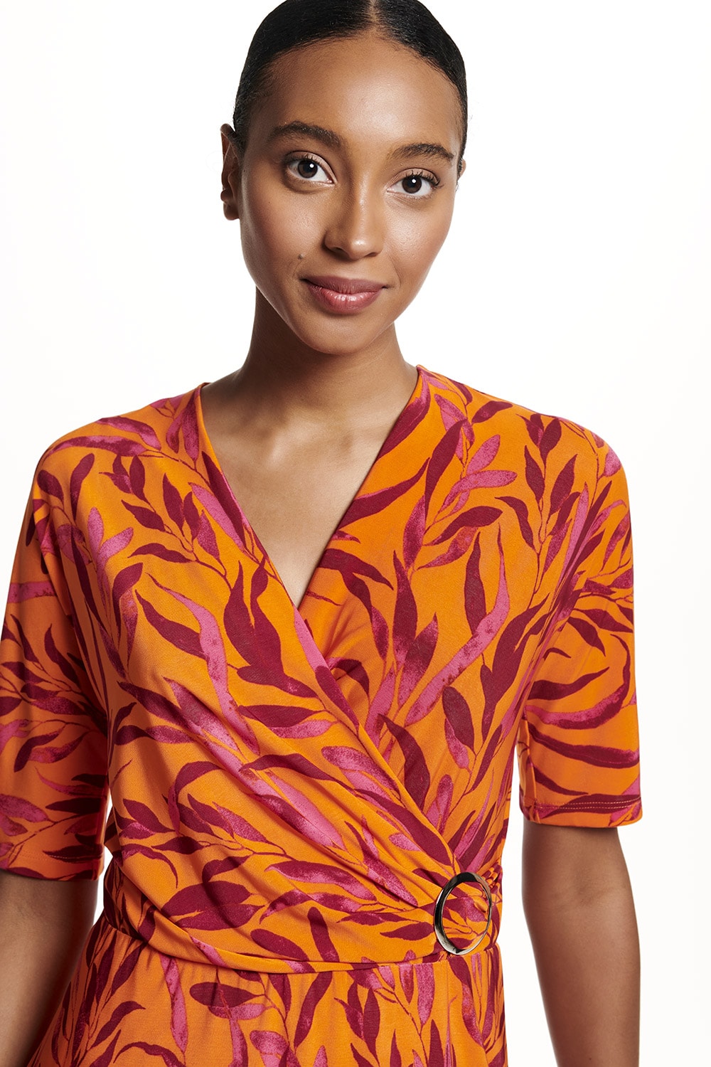 Vestido midi em malha fria estampada, decote v transpassado com detalhe de fivela em metal e mangas 7/8. Clássica e elegante para qualquer ocasião.