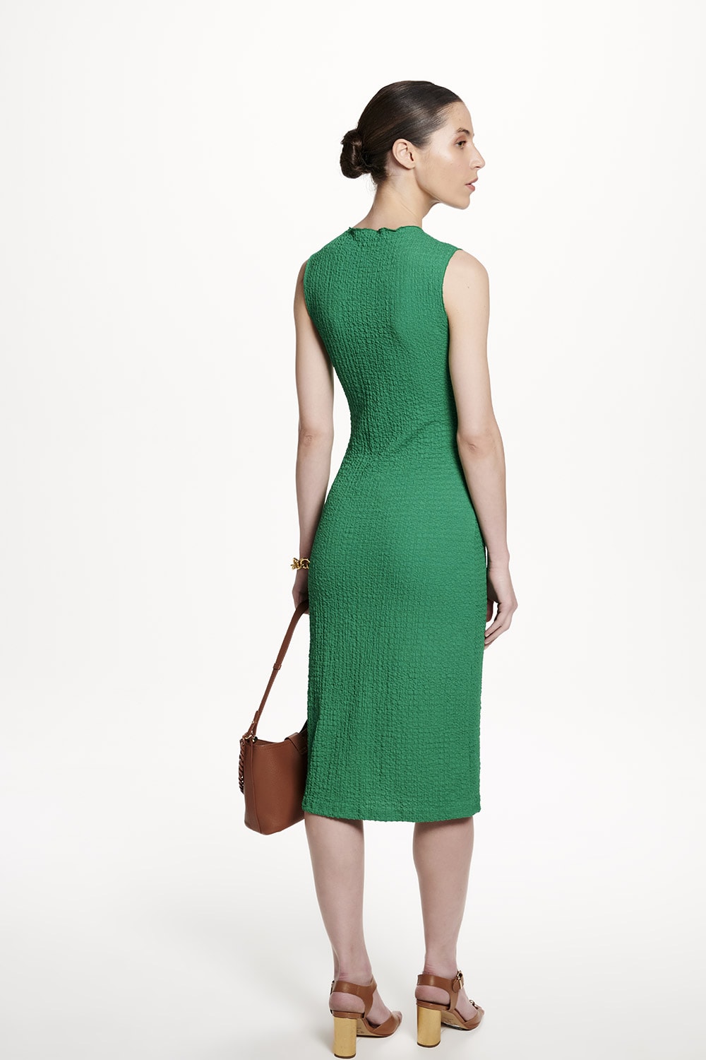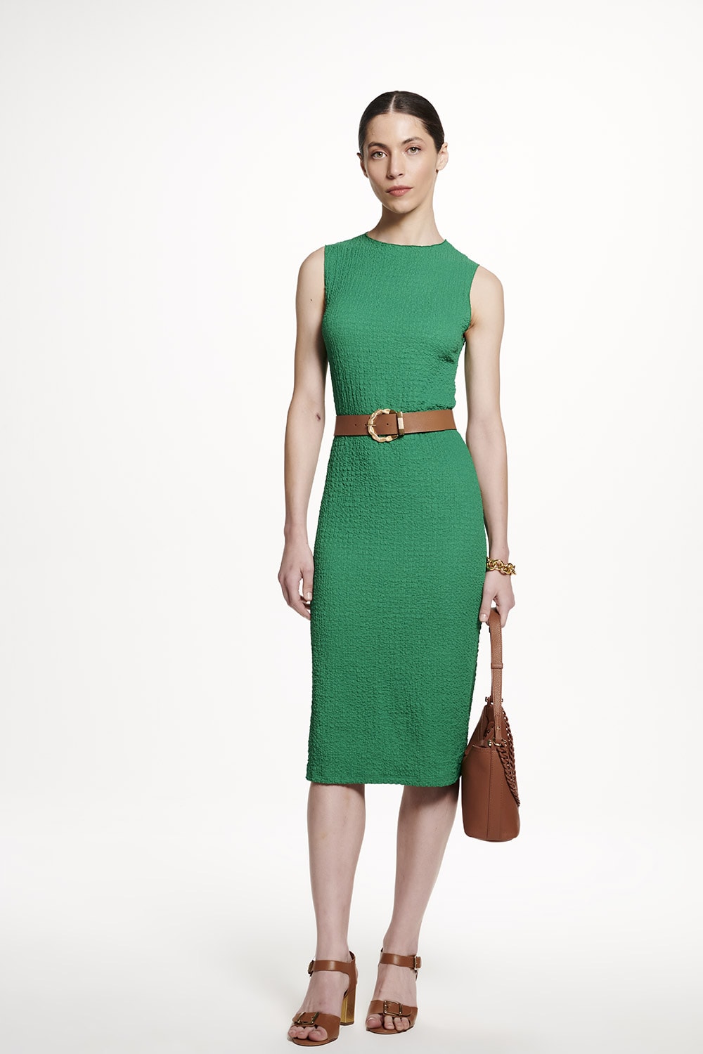 Vestido em malha texturizada, tem elegante comprimento midi. Combinando com salto alto vai para aquela ocasião especial e se usar com tênis, fica jovial e descontraído.