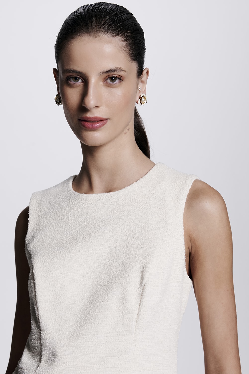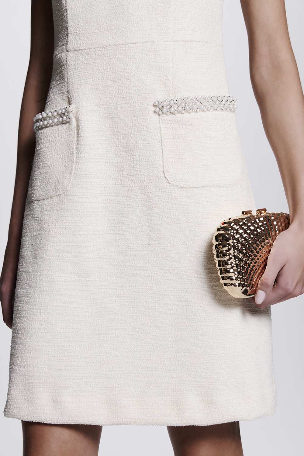 Delicado e atemporal, o vestido de malha tweed combina elegância e conforto. Com modelagem evasê, possui aplicação pedras com aparência de pérolas. Pode ser usada com o spencer Ref.: 51.09.0018.