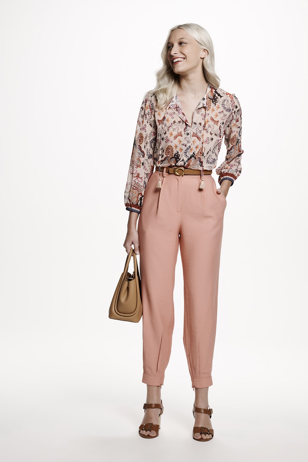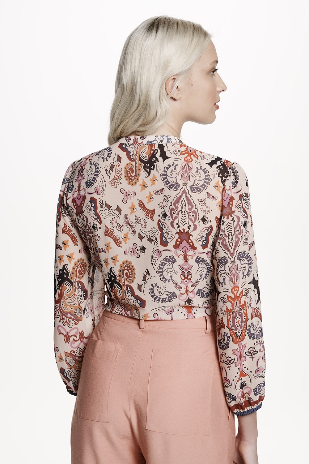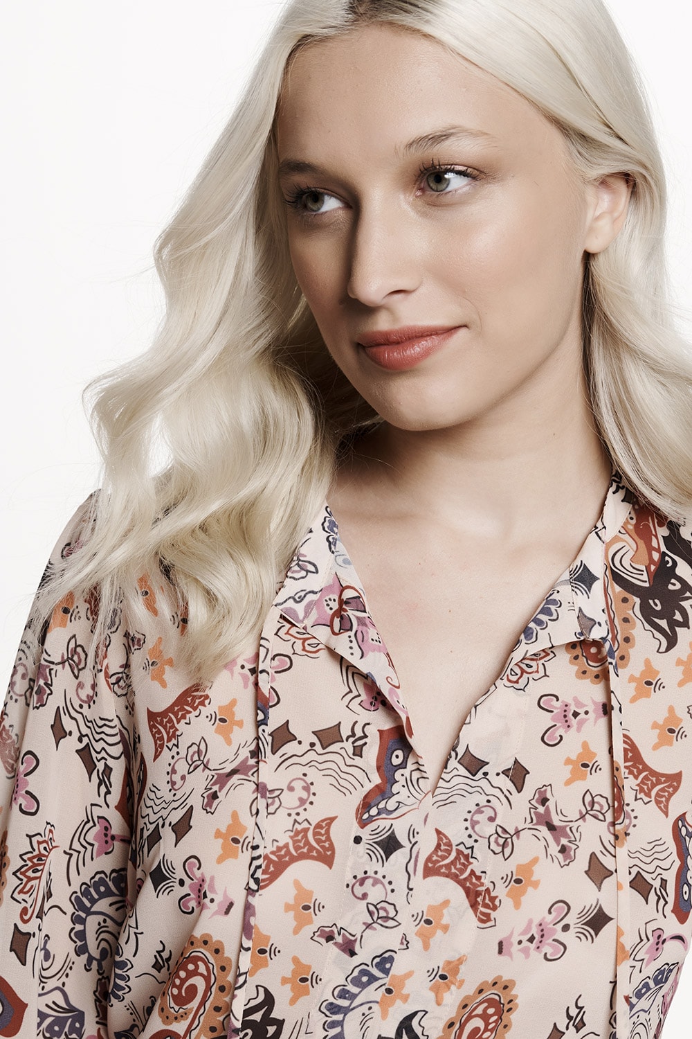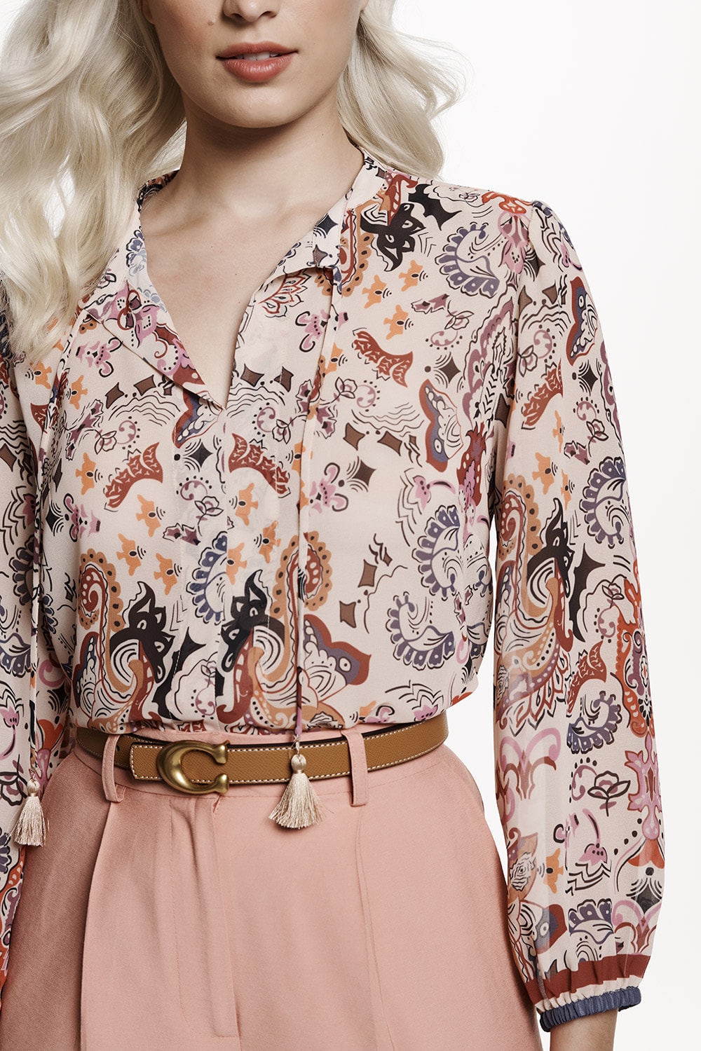 Bata em estampa barrada e tem amarração no decote em lindas cores.